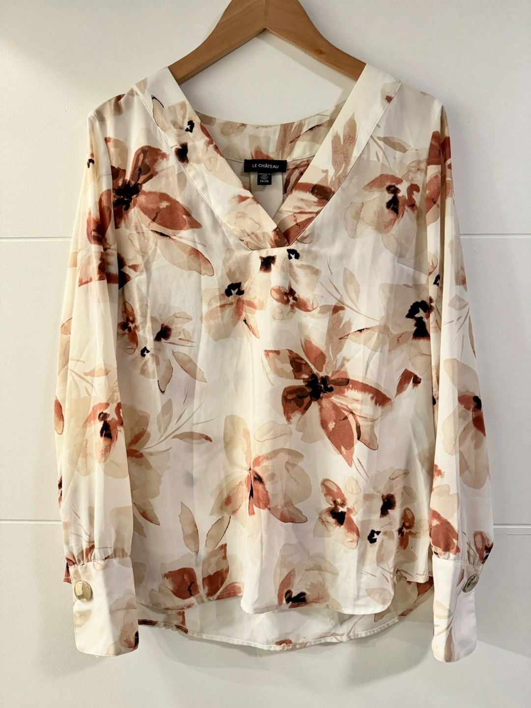 Lovely floral long sleeve blouse from Le Chateau! Size xs but fits a bit oversized. Has a v-neck, lining and gold button detailing on the sleeve. Very flattering, great for the office! In perfect condition, Never really wore it.