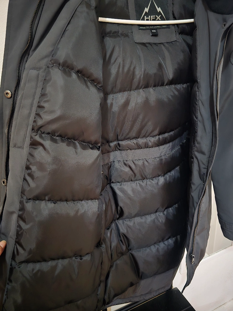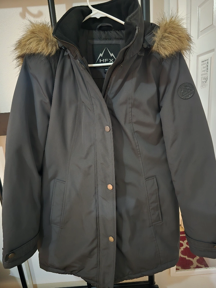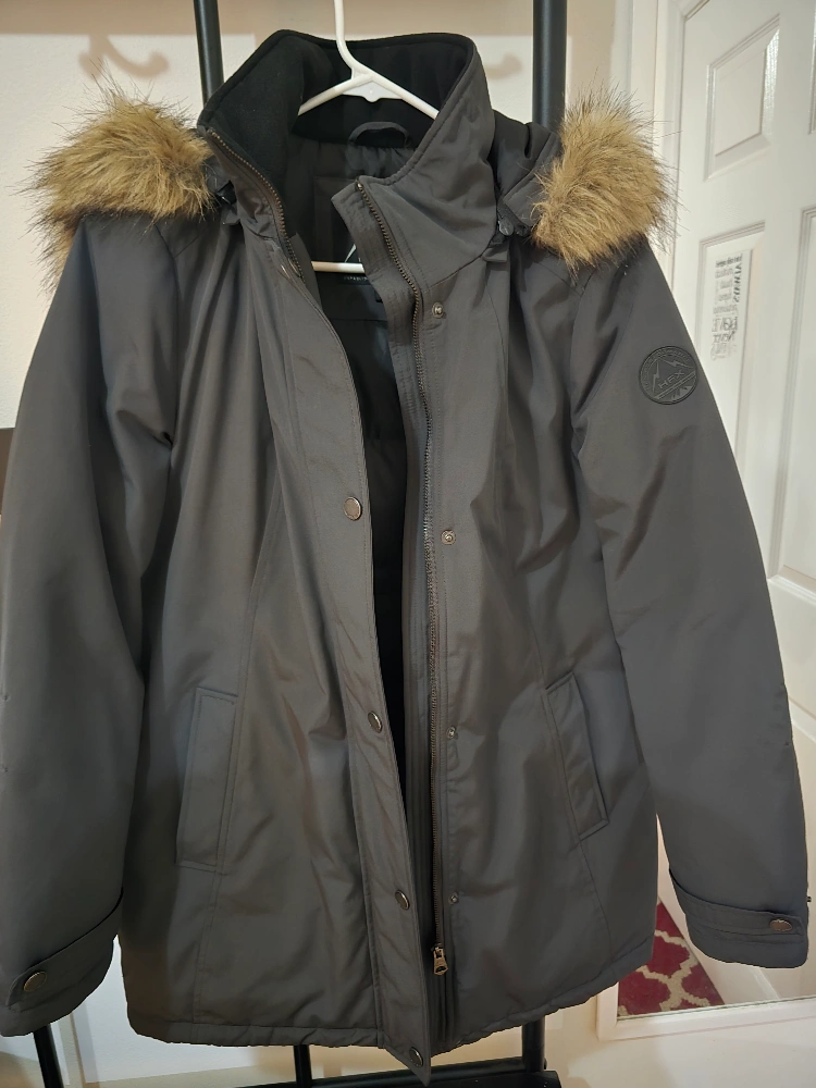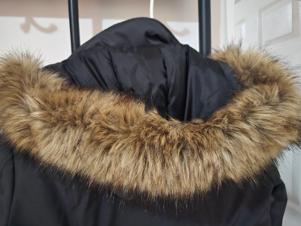 Winter parka with fur hood. Has pockets and a zipper closure. The coat is warm and comfortable.