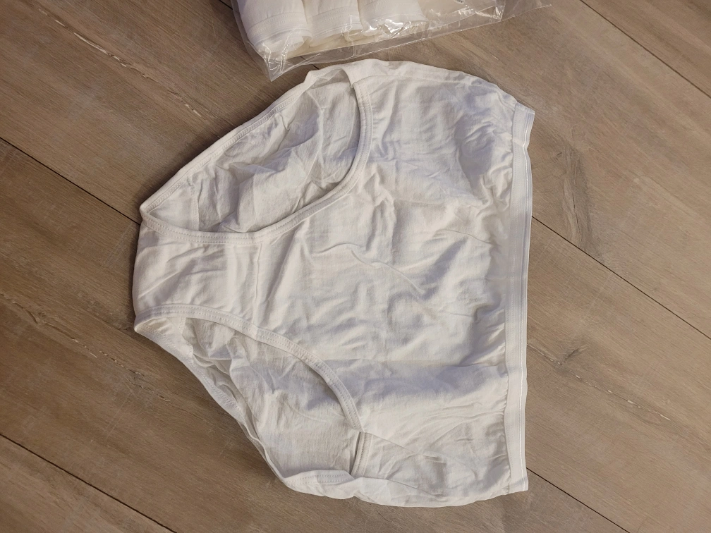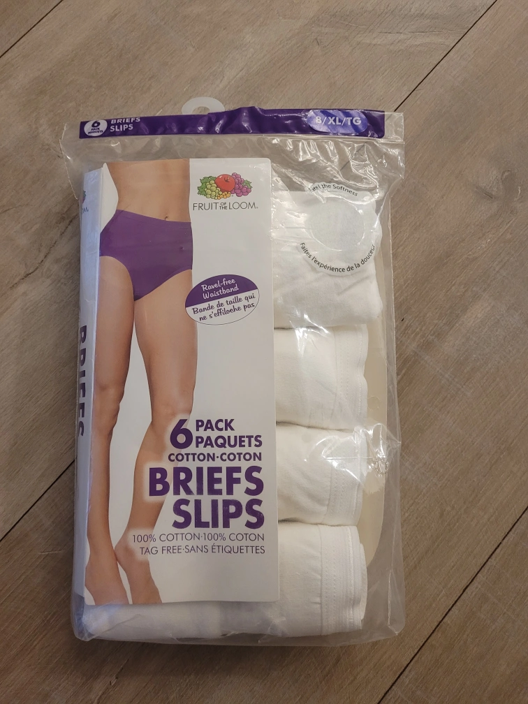 6 pack of women's briefs. White, cotton, tag free. Size L/XL/TG.