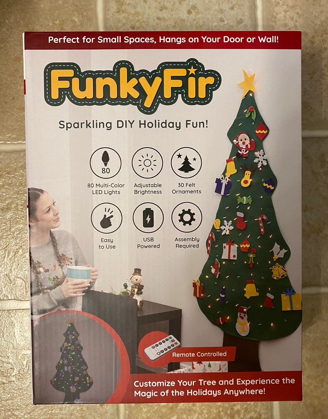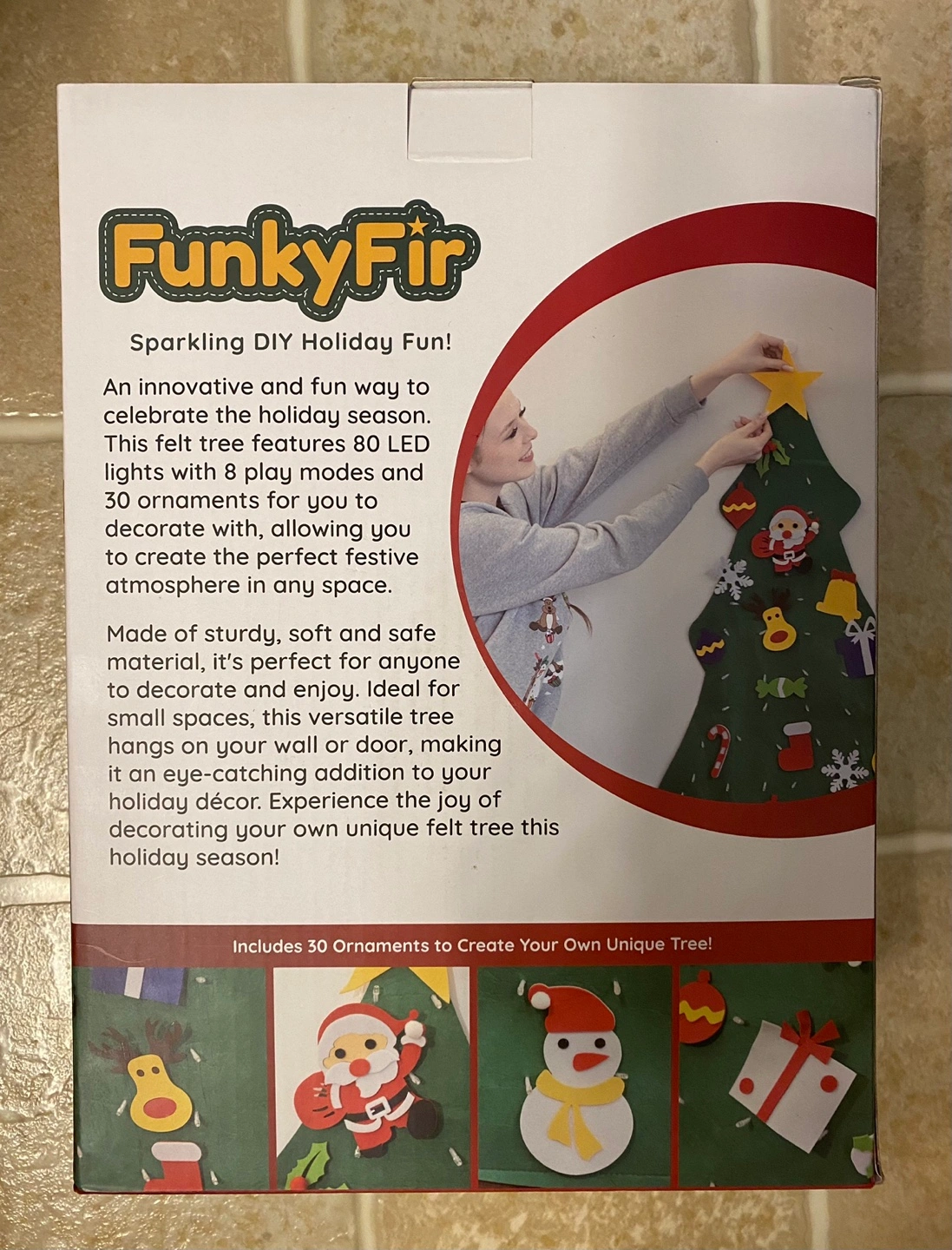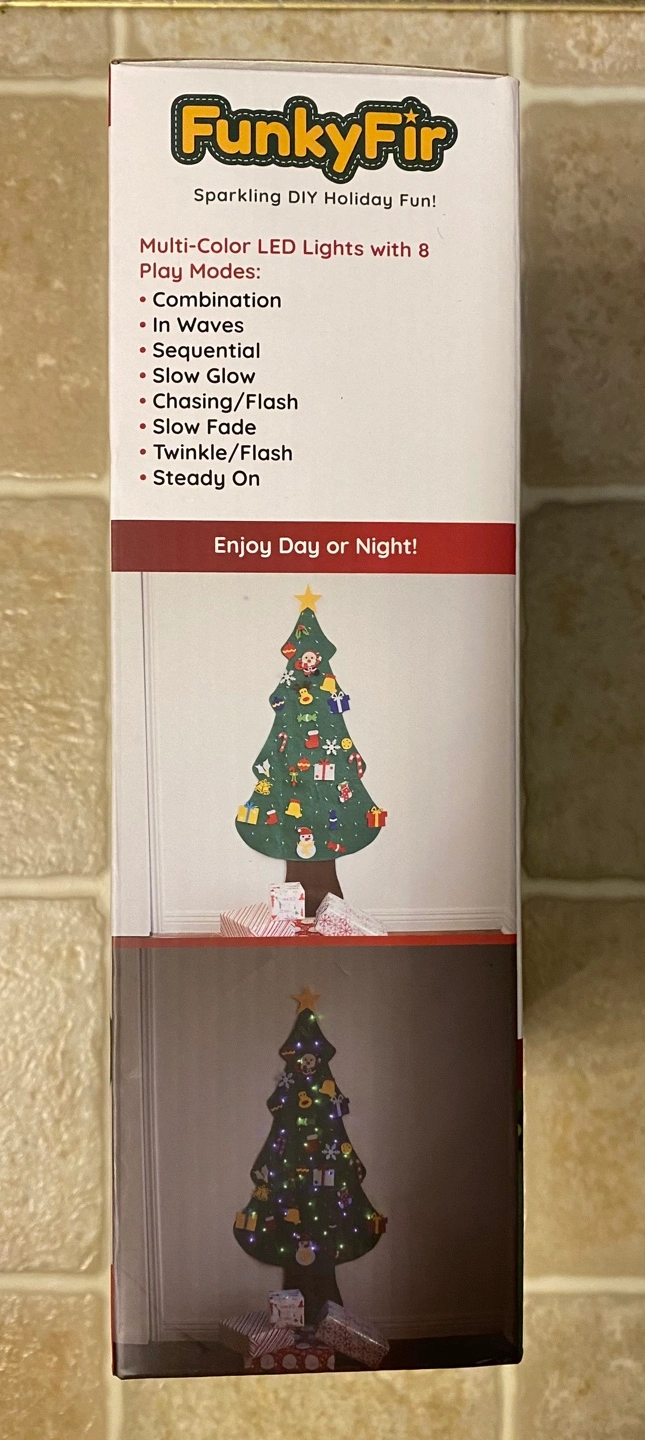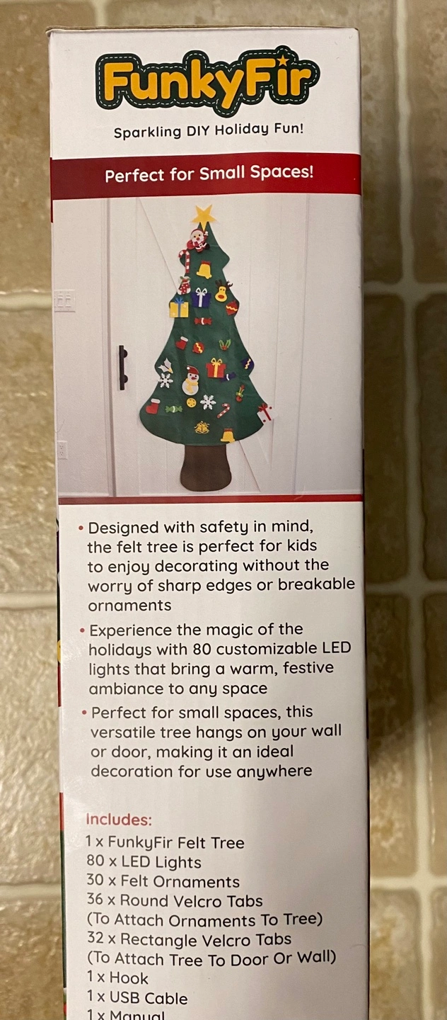 Felt Christmas tree with 80 LED lights, 30 ornaments, and remote control. Perfect for small spaces, hangs on wall or door. Have 5 available. Brand new. Pick up in Chestermere.