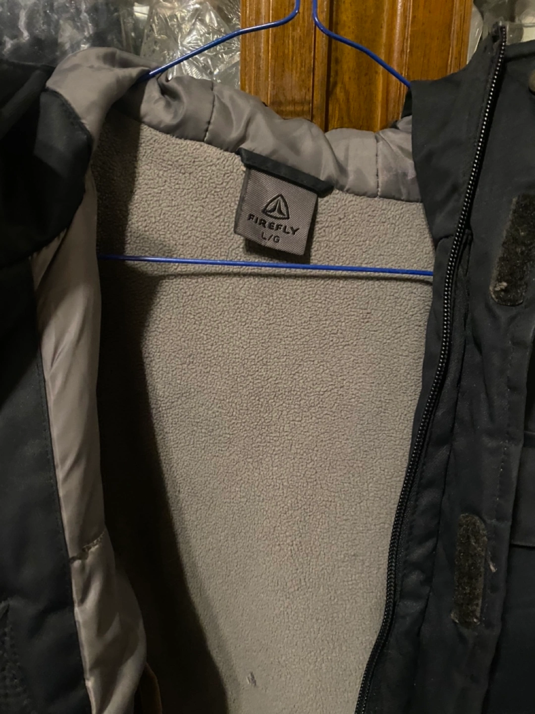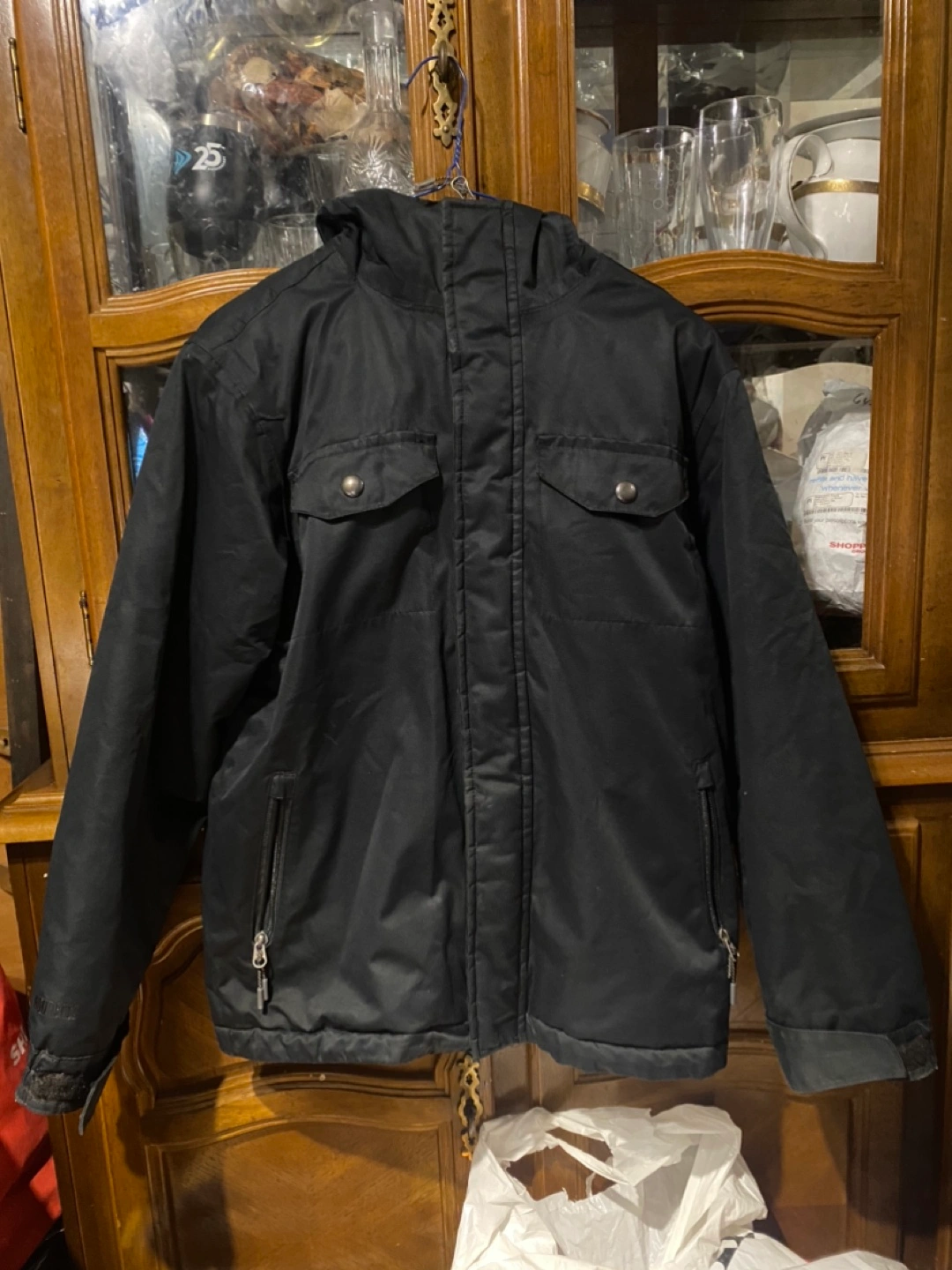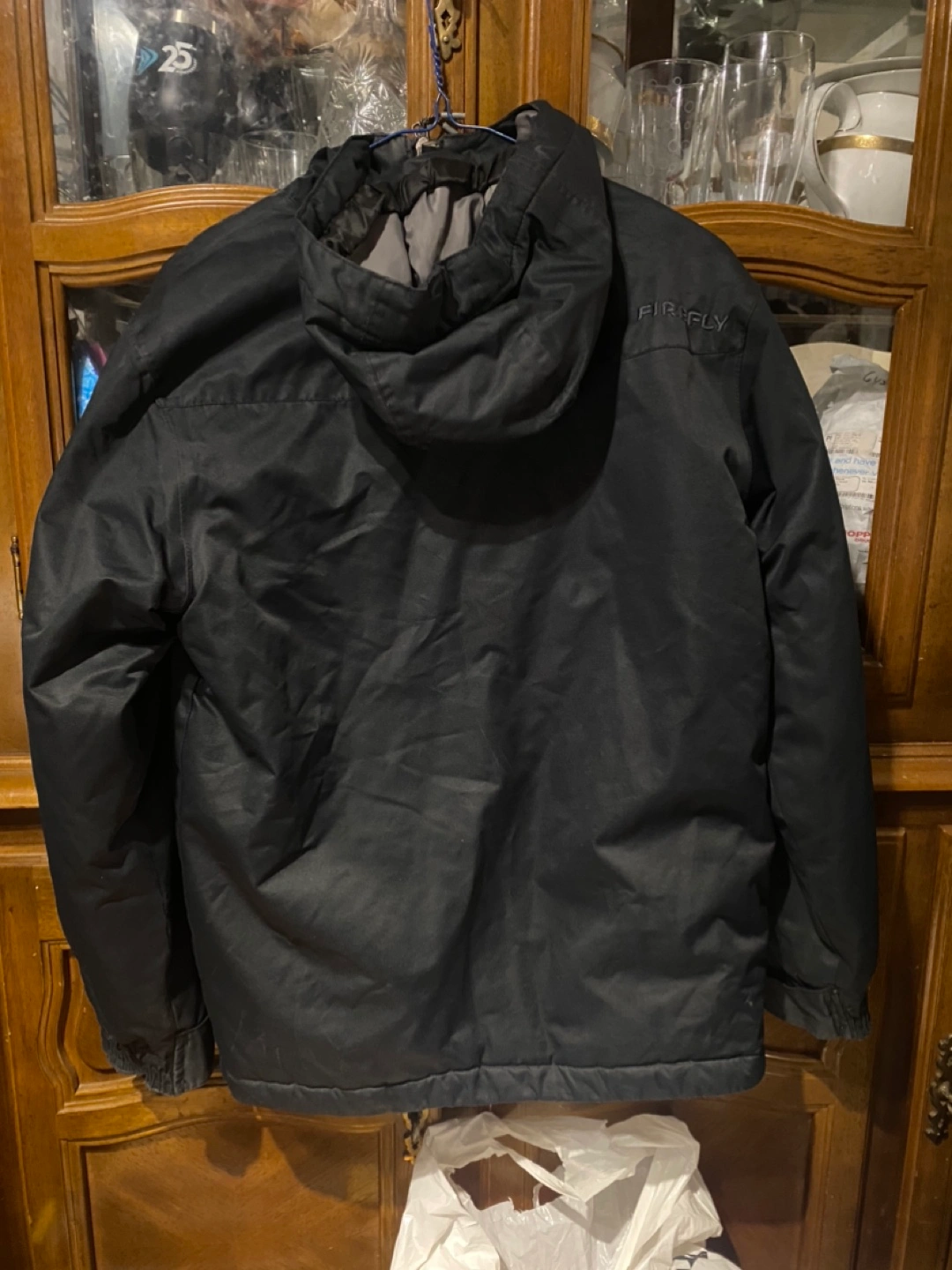 Black winter jacket with a hood and fleece lining. Two zippered pockets and two flap pockets.