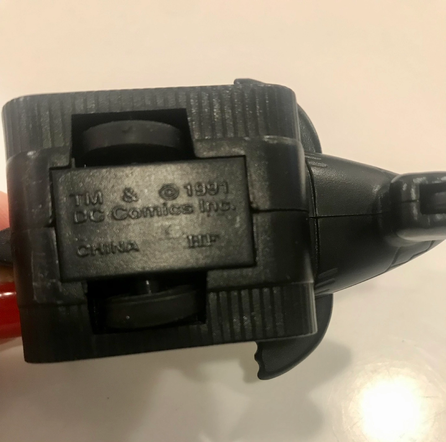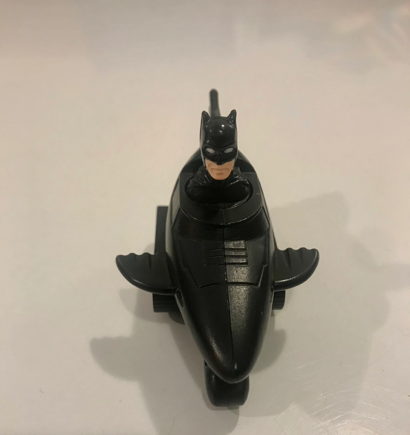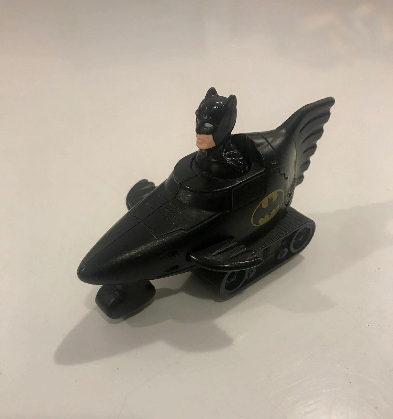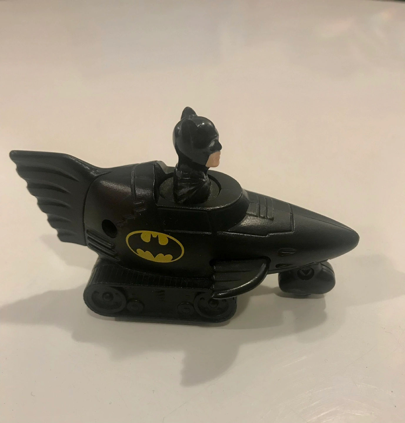 Vintage Batman Batmobile toy. Black plastic with gold detailing. Batman figure sits in the Batmobile. I think it was a McDonalds happy meal toy