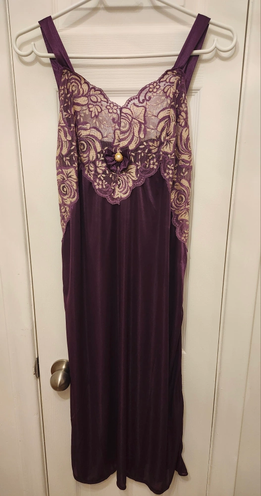 My mom had this in her closet and only worn once. She had washed and stored in closet. The lace on the top is see through.