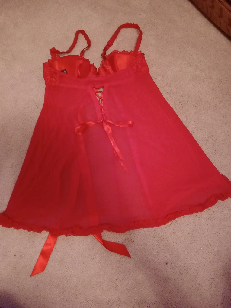 Sexy red babydoll with adjustable straps. Features trim and a ribbon tie at the front and back
