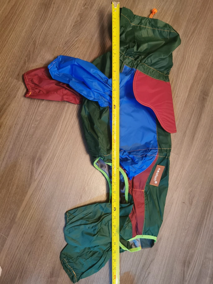 110Multicoloured dog raincoat with a hood and a zipper. It has a reflective strip on the back. m