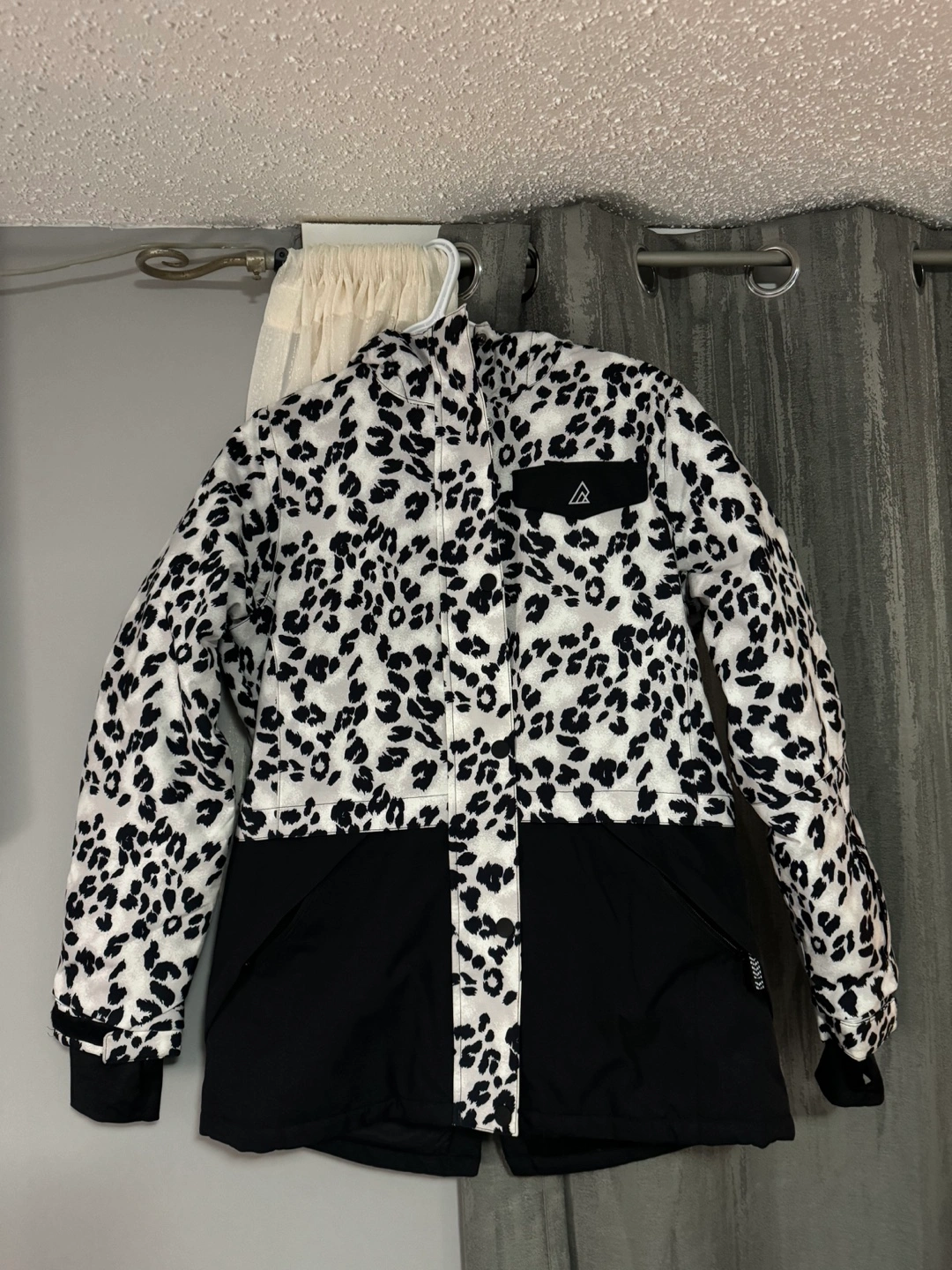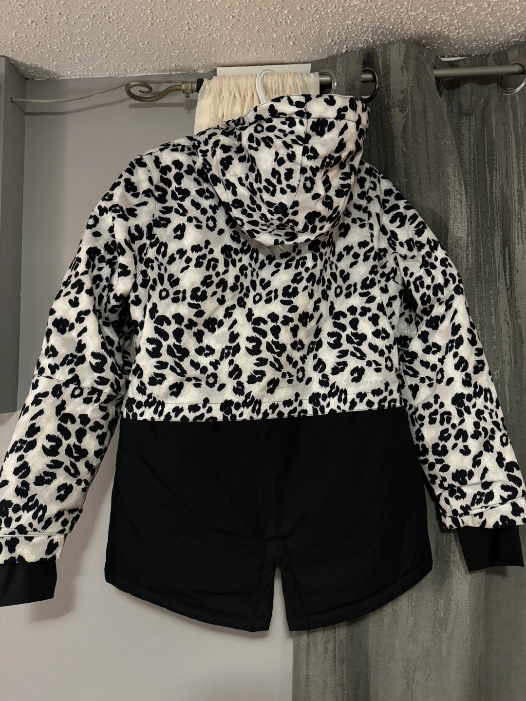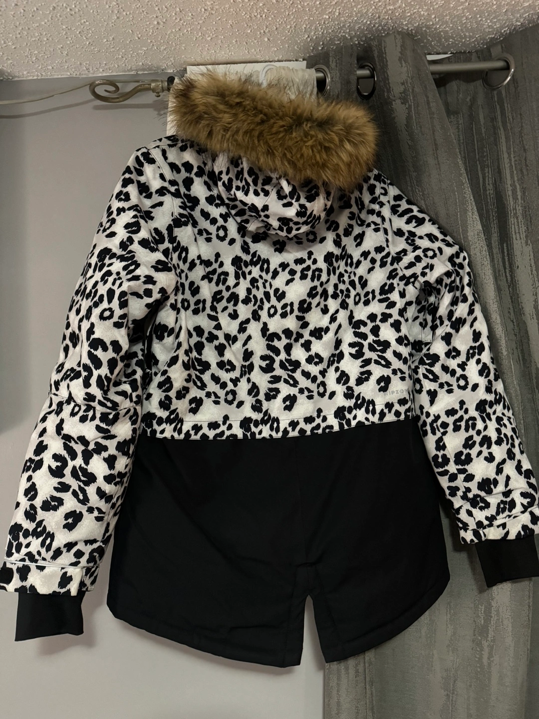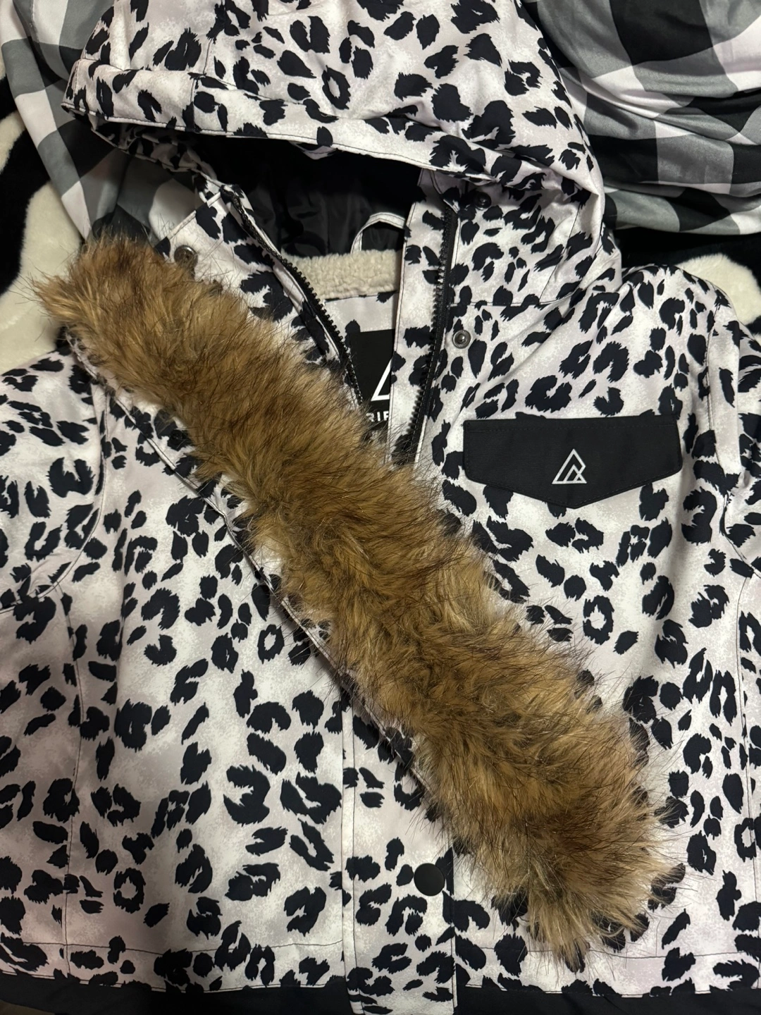 Women's snow jacket with a leopard print and a faux fur hood. Black and white.
