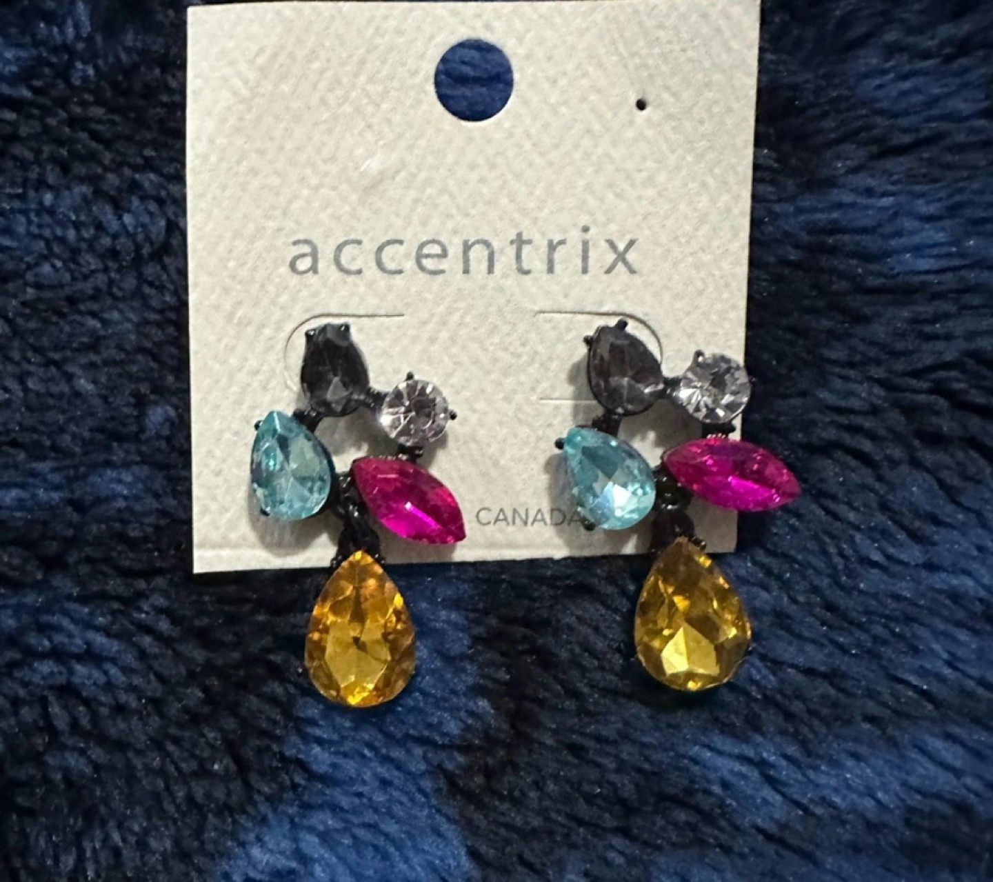 Multicoloured crystal earrings, teardrop shaped, with dark metal accents. The earrings are about 2 inches in length.