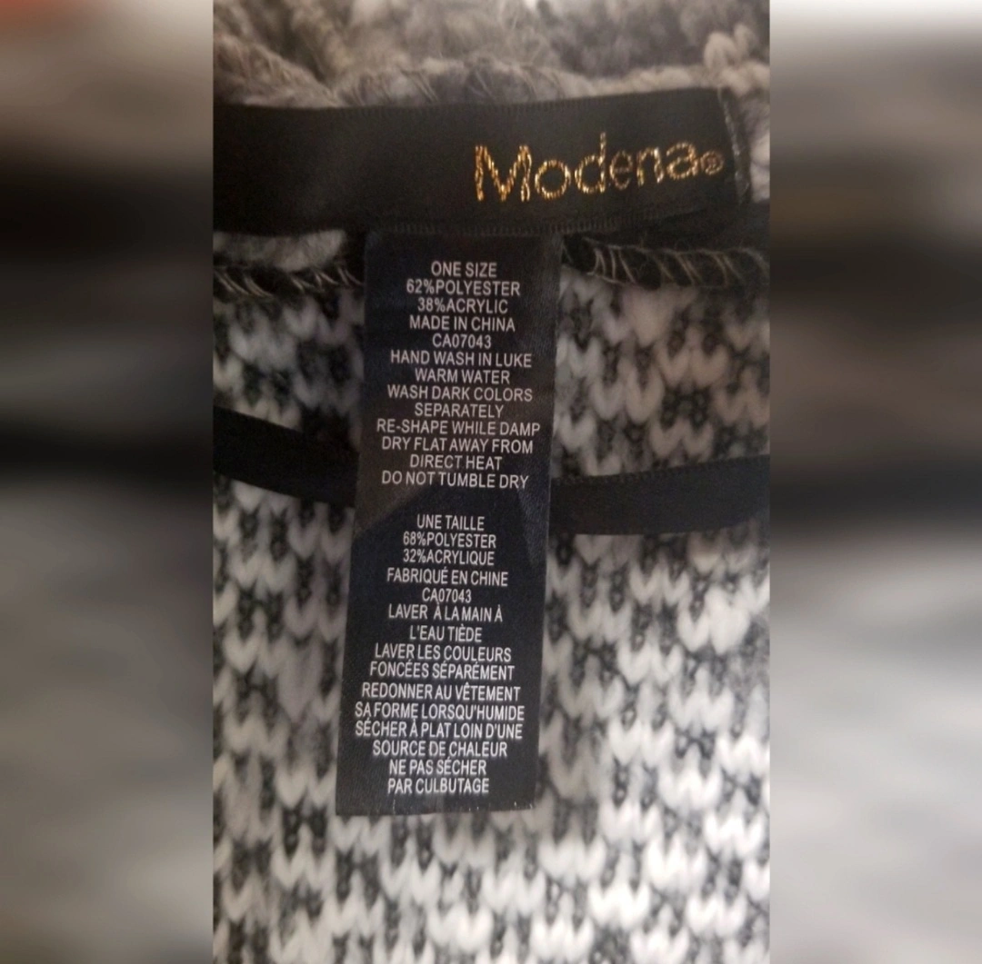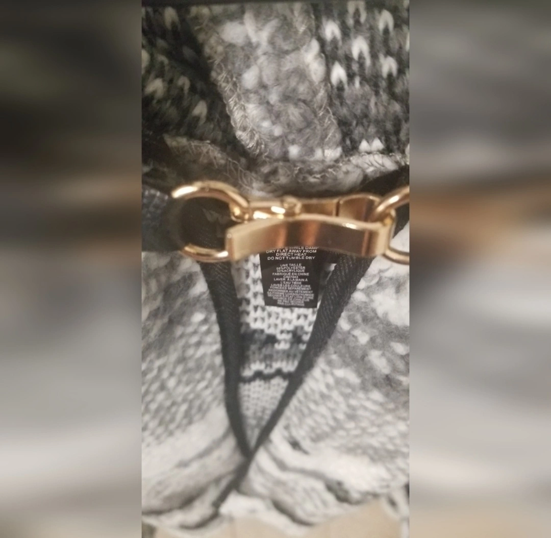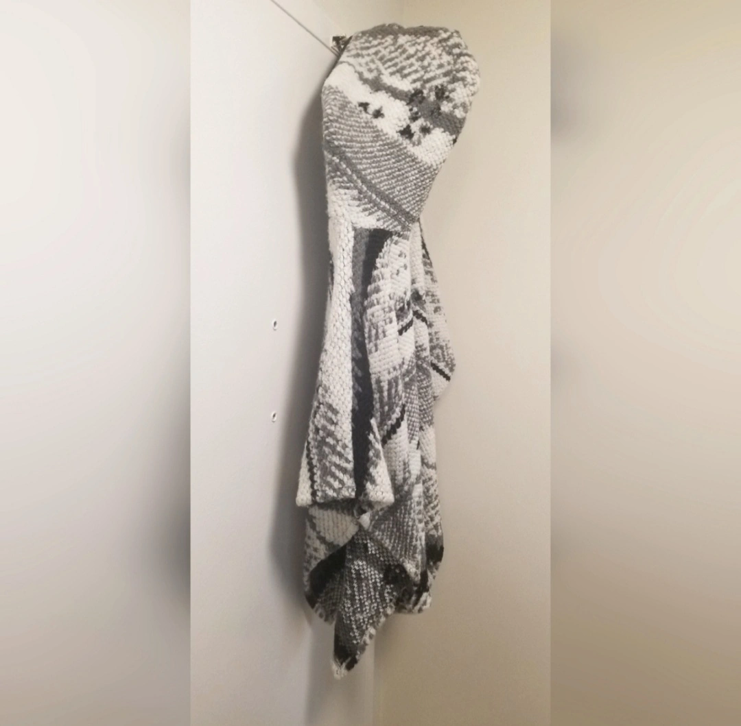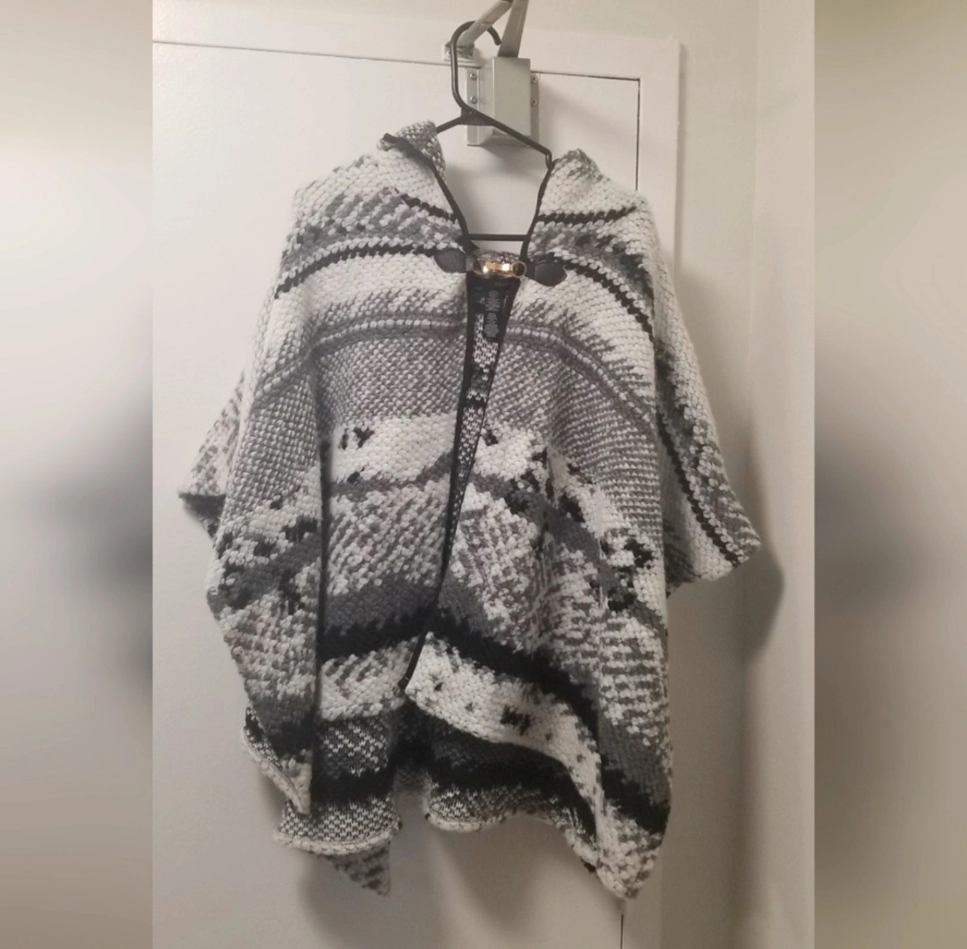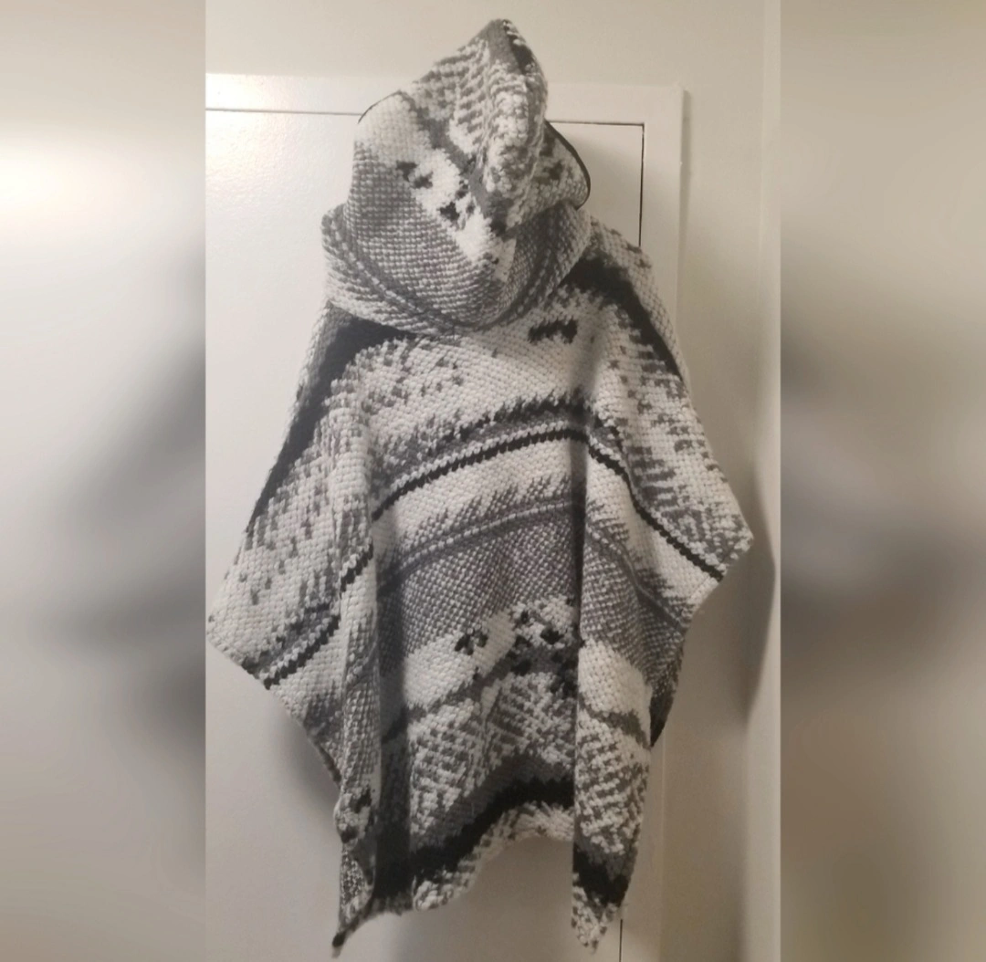 New without tags, never worn. perfect addition to your trendy Fall wardrobe. Stunning black, grey and white knitted/quilted-style poncho with roomy attached hood and clasp closure (see photos).