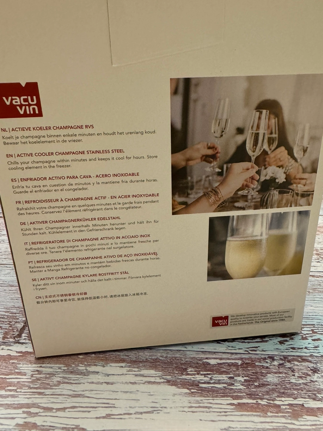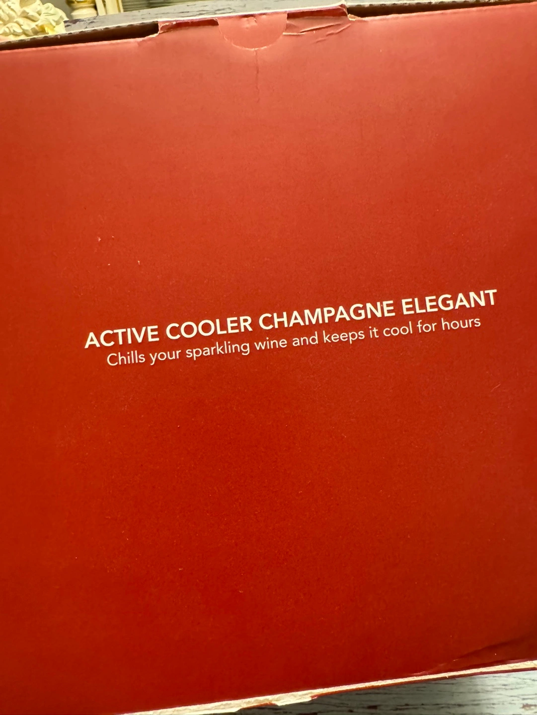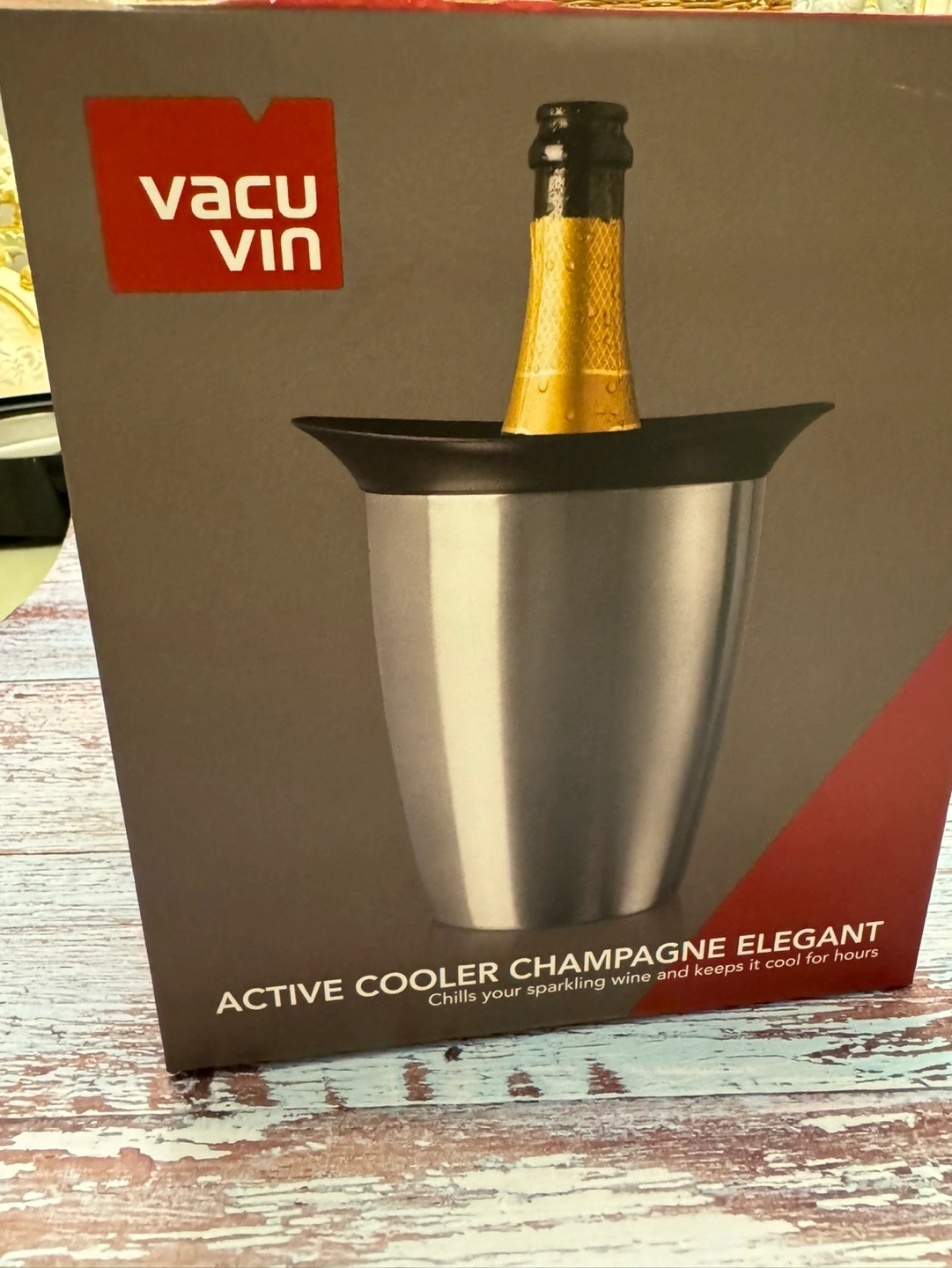 Stainless steel champagne cooler with a black lid. Keeps your sparkling wine cool for hours. Cash and pick up only at Markham.