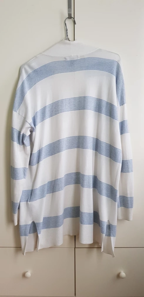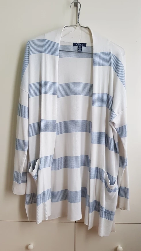 1000+Long-sleeved cardigan with blue and white stripes. Has pockets. Cash only Pets free, smoke free home Pickup near or at Cornell Public Library, or Delivery to Markham, Pickering, or Stouffville