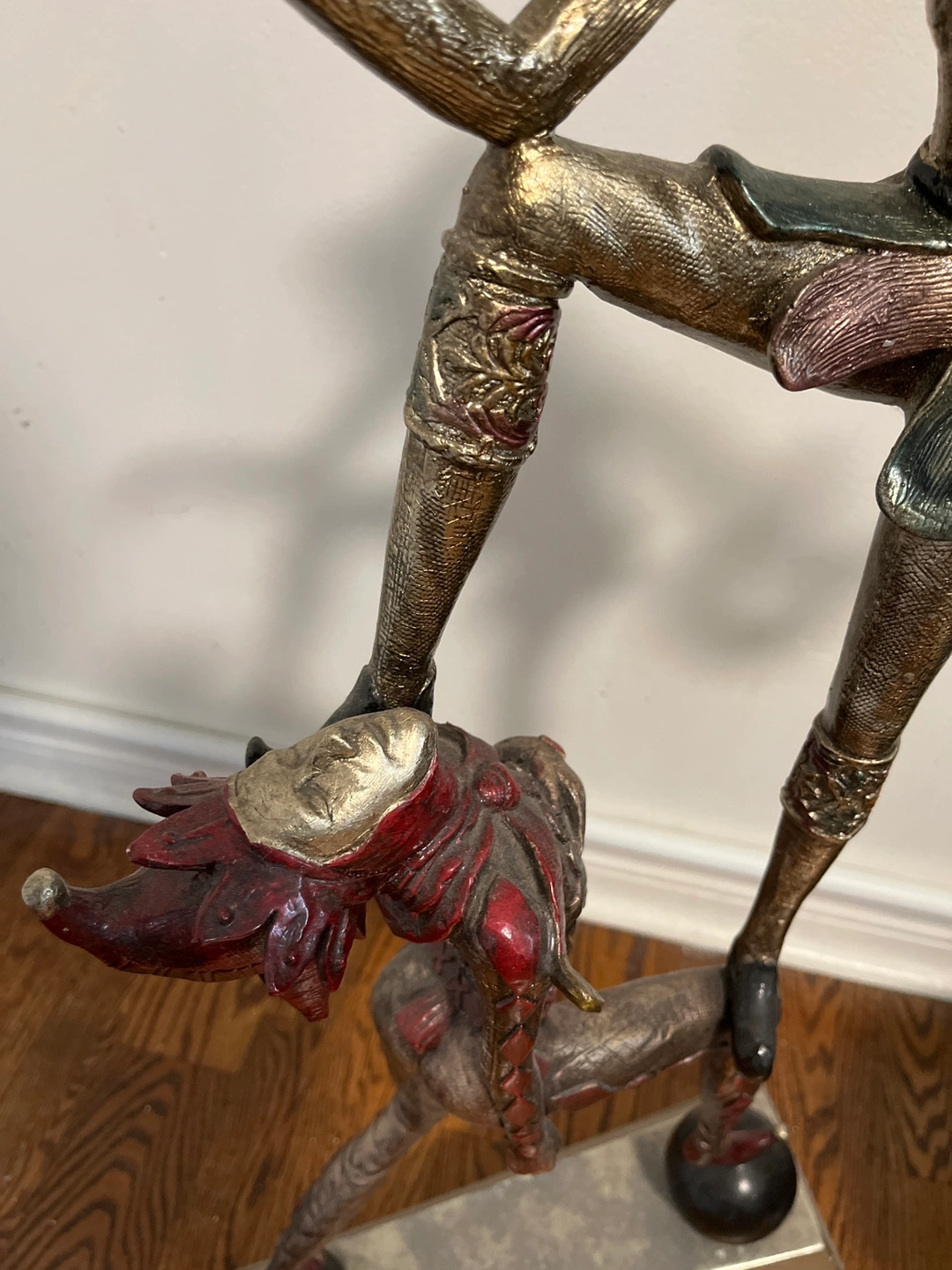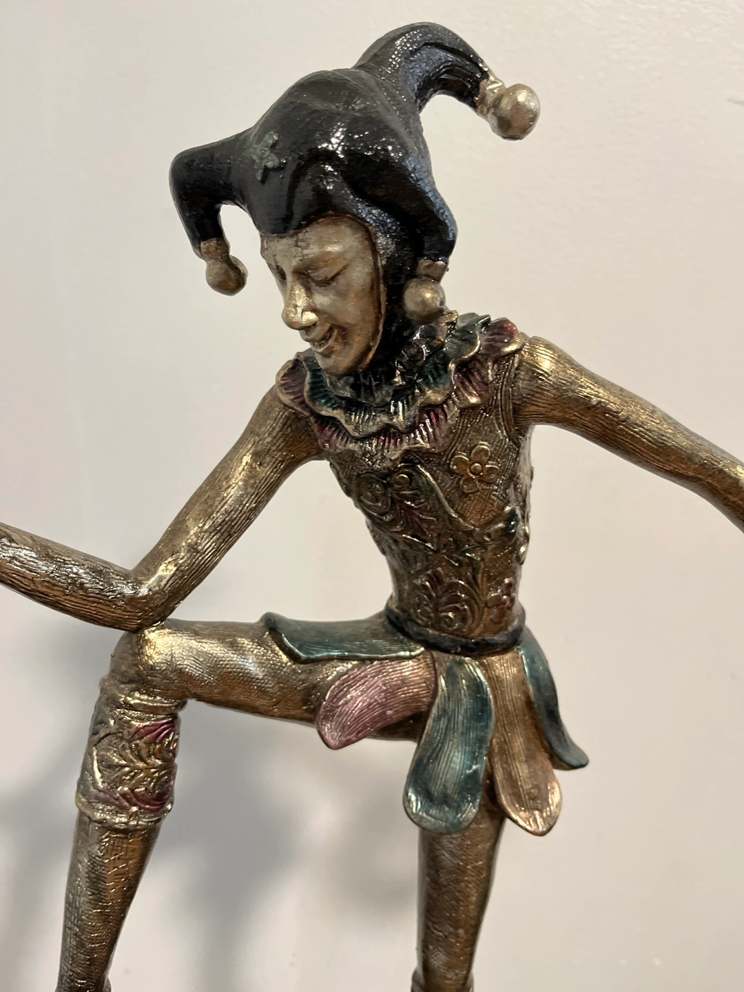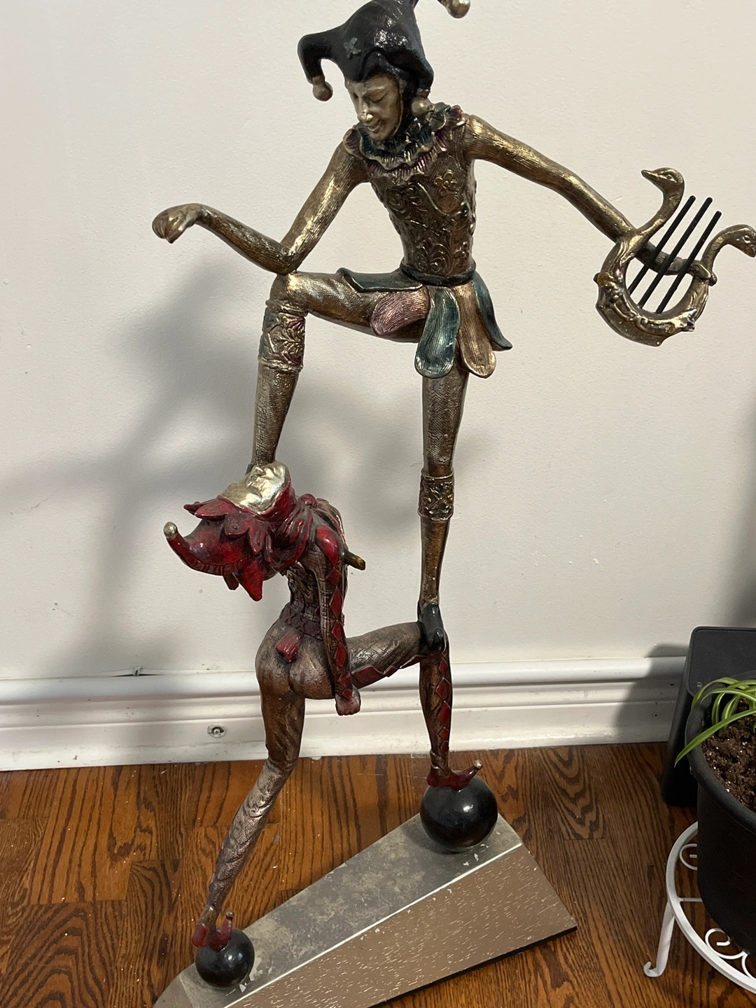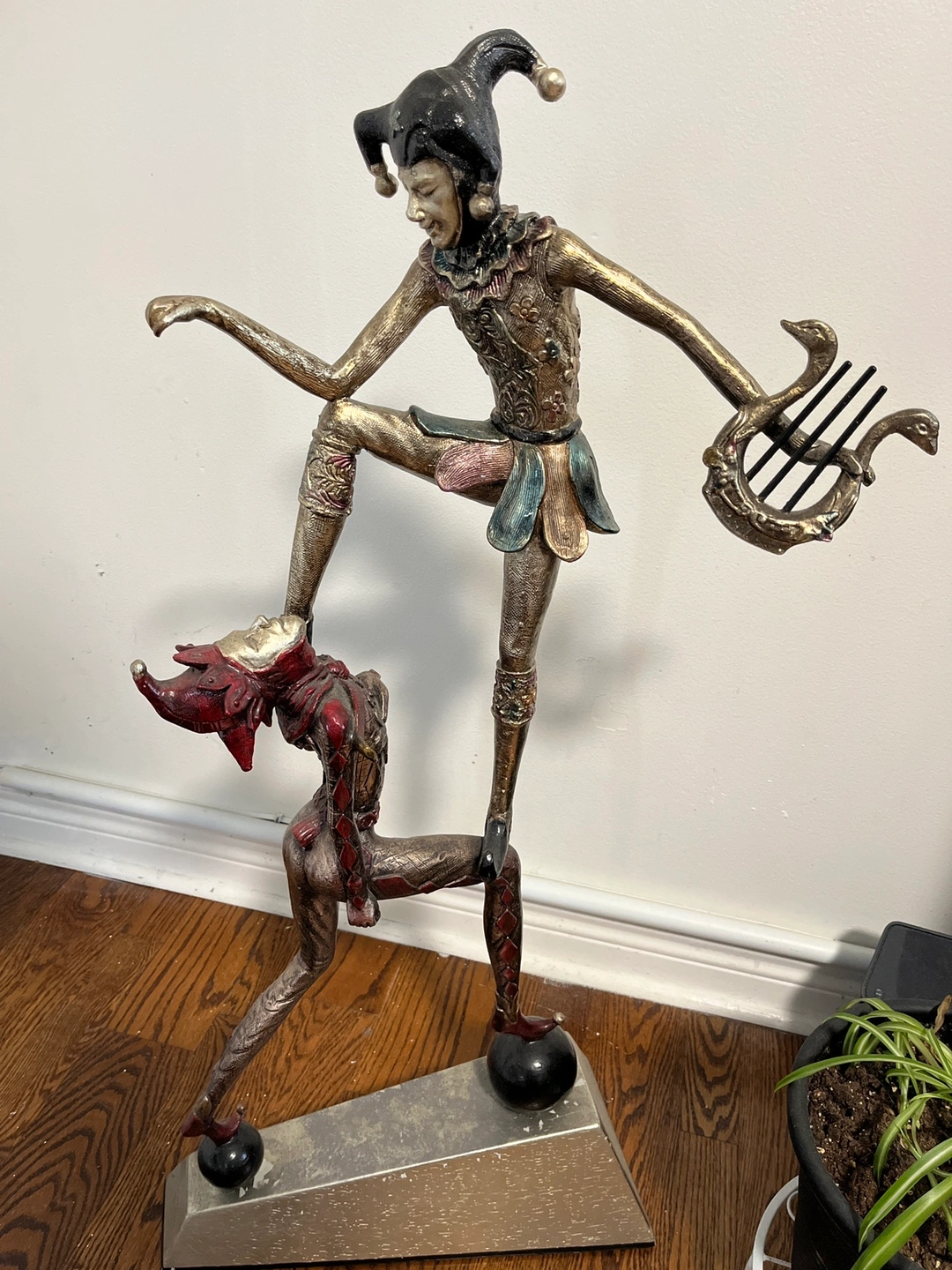 jester statue with two jesters balancing on top of each other. One jester holds a lyre.