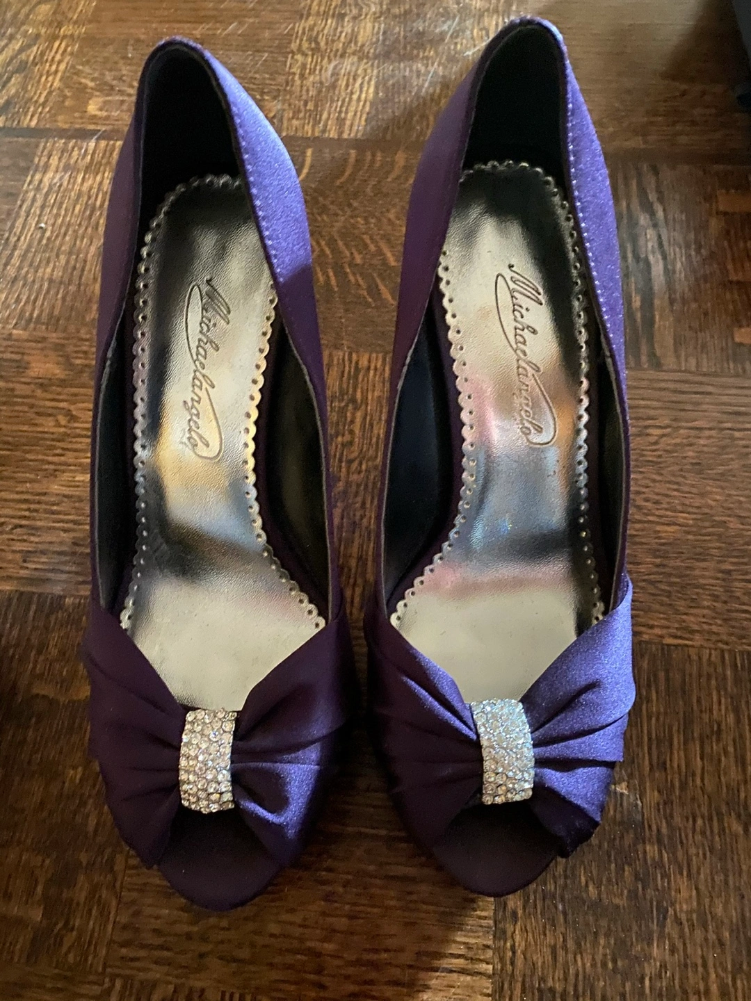 53Purple satin heels with rhinestone bow. Peep toe. Beautiful shoes, worn Once, Purchased at David’s Bridal. Size 6.5. Pickup Bathurst and finch area
