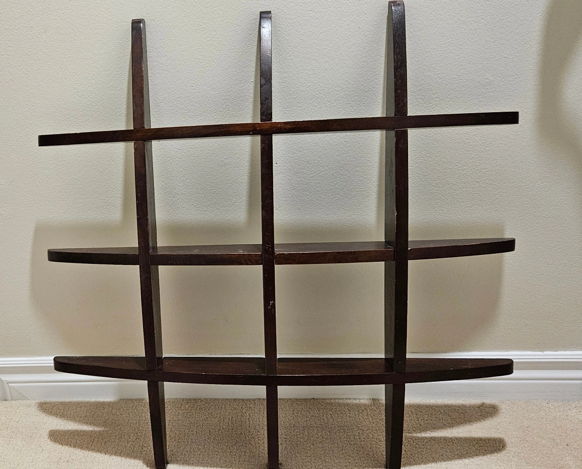 Beautiful Wooden wall shelf, chestnut color, with great curved shelves, perfect for adding a touch of warmth to any room and perfect for displaying small favourite items.