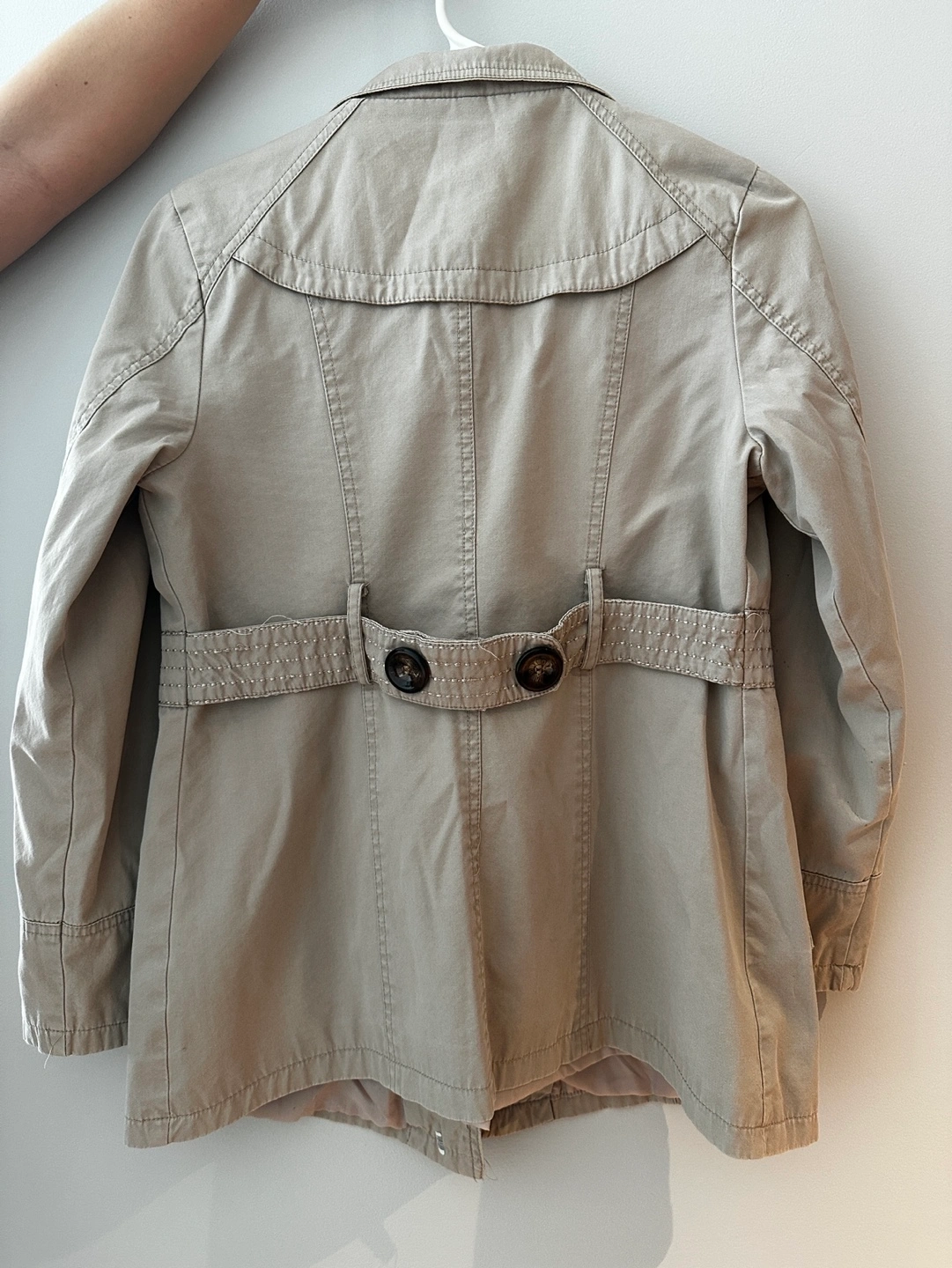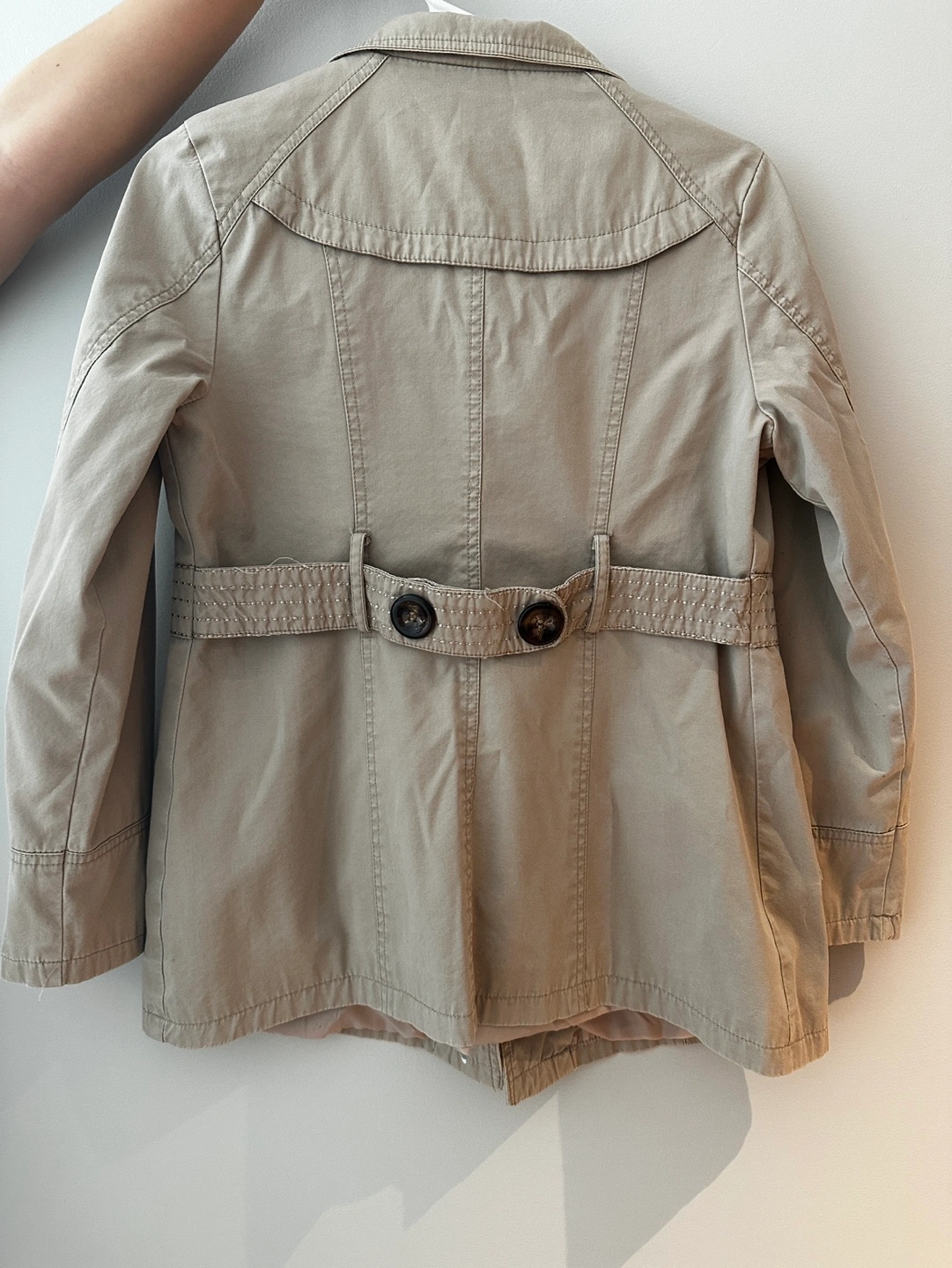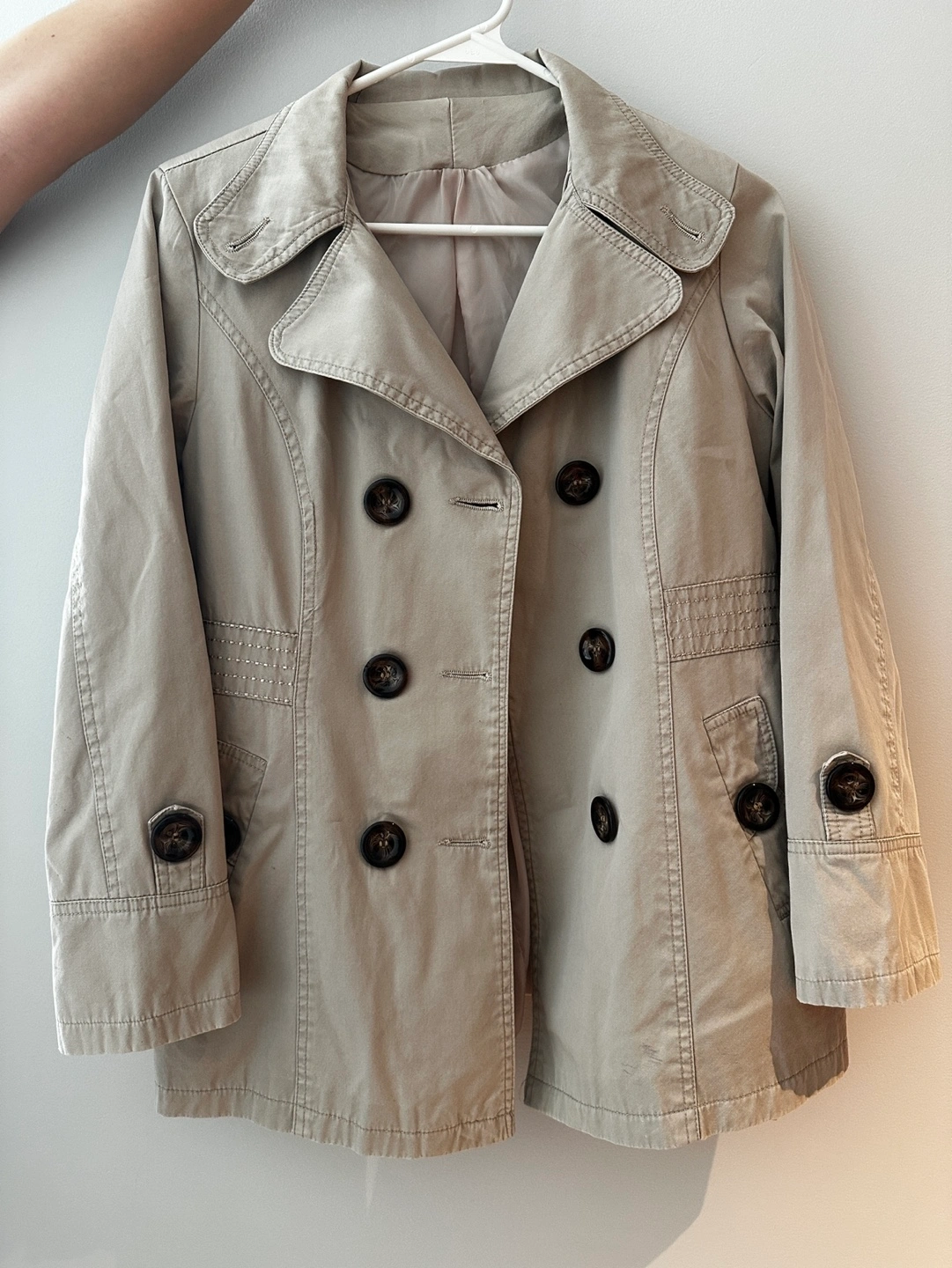 excellent used condition. This pea coat is in a khaki style and is a size small. Super cute buttons down the front as well as pockets on each side. Minor signs of wear include some fading of material or pilling.
