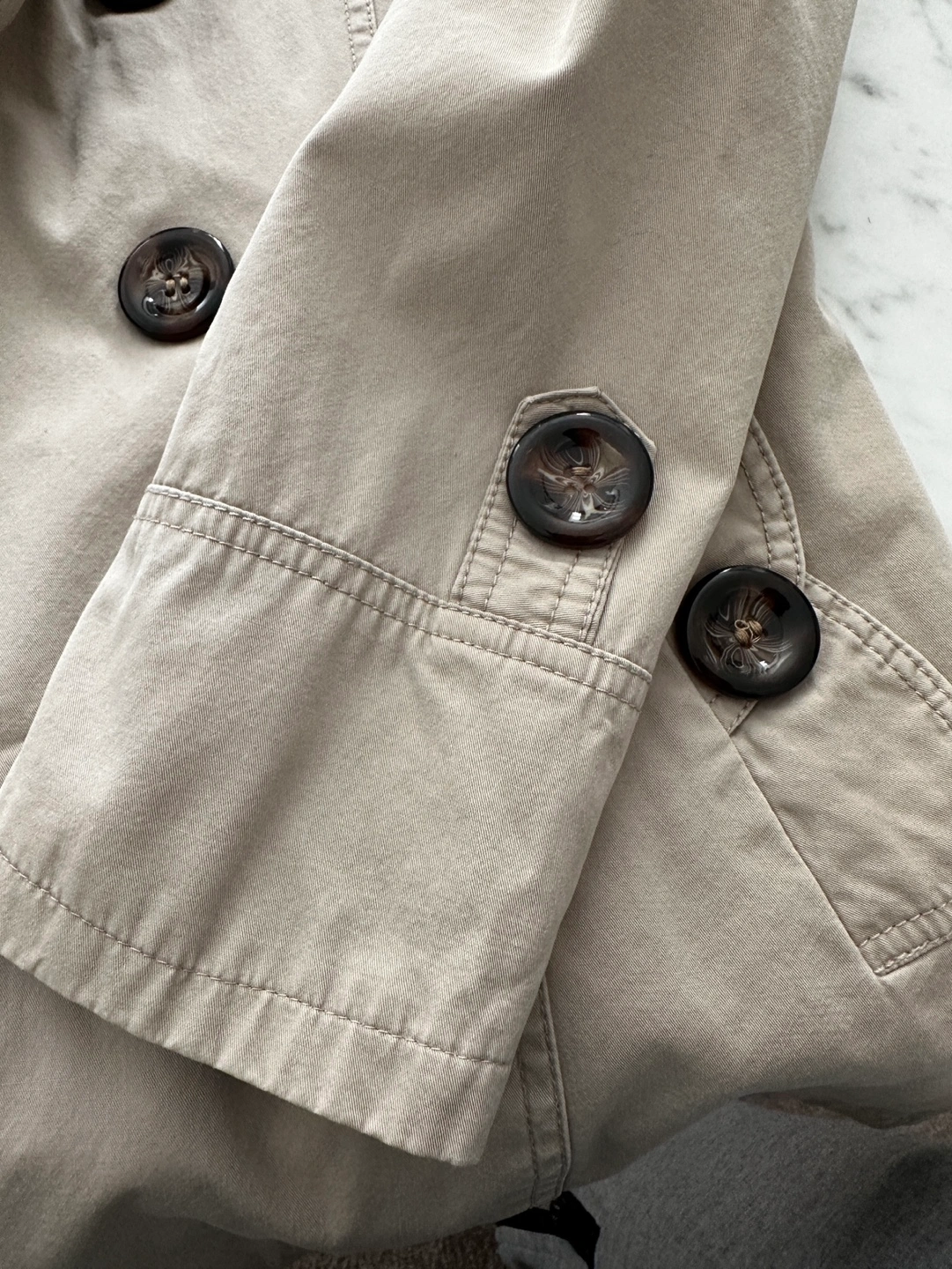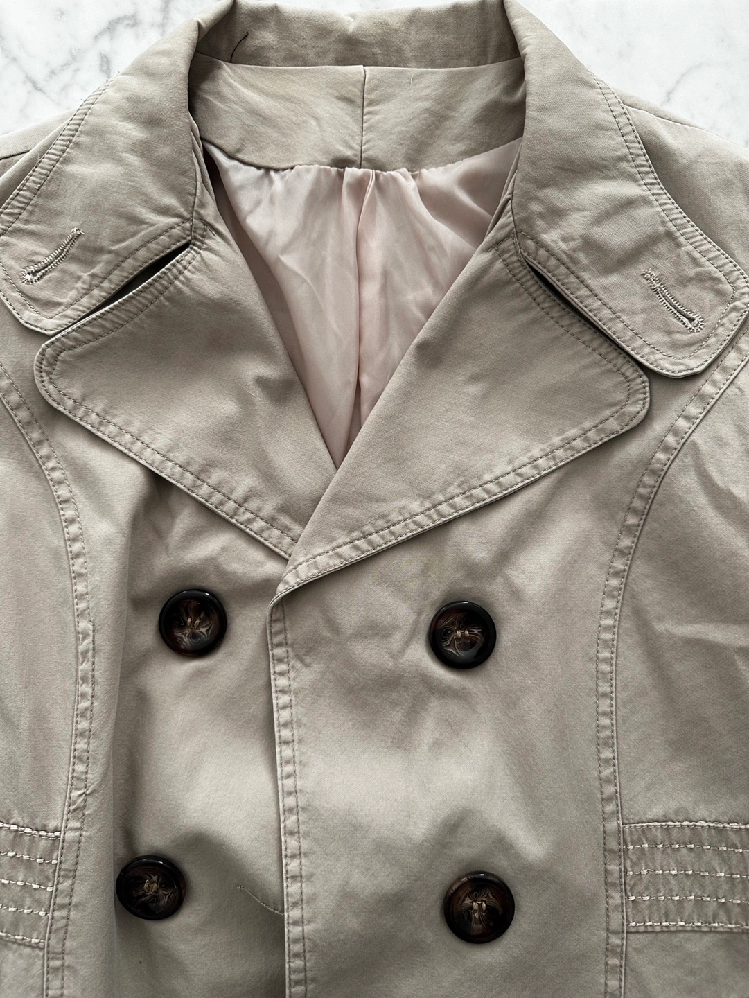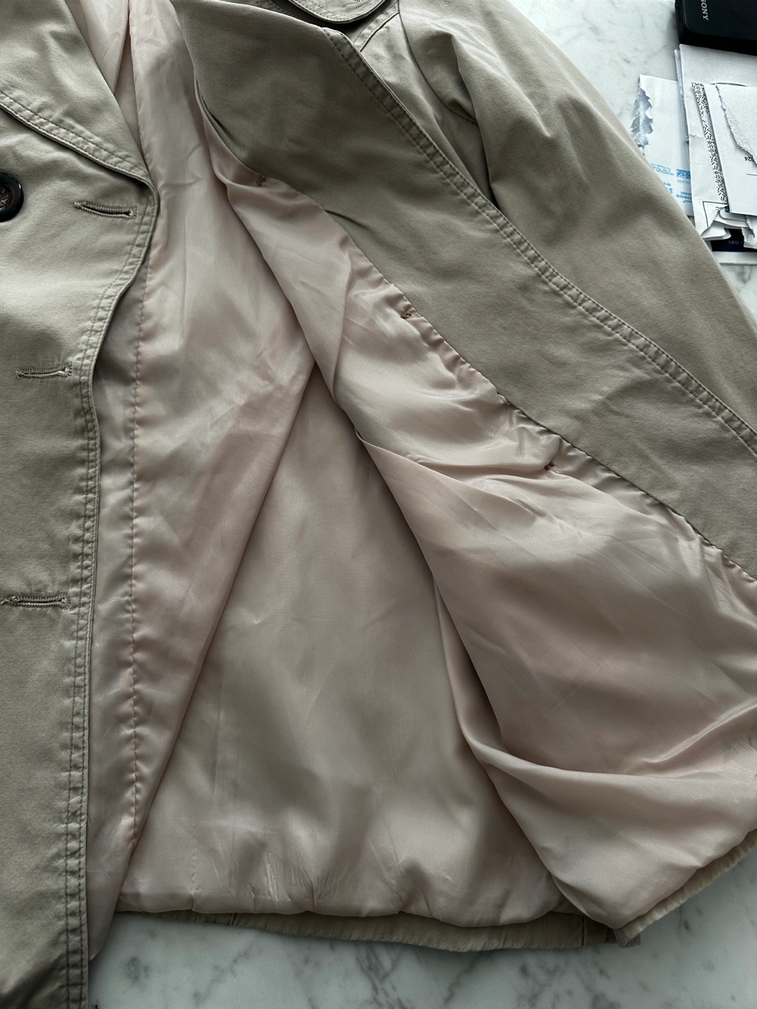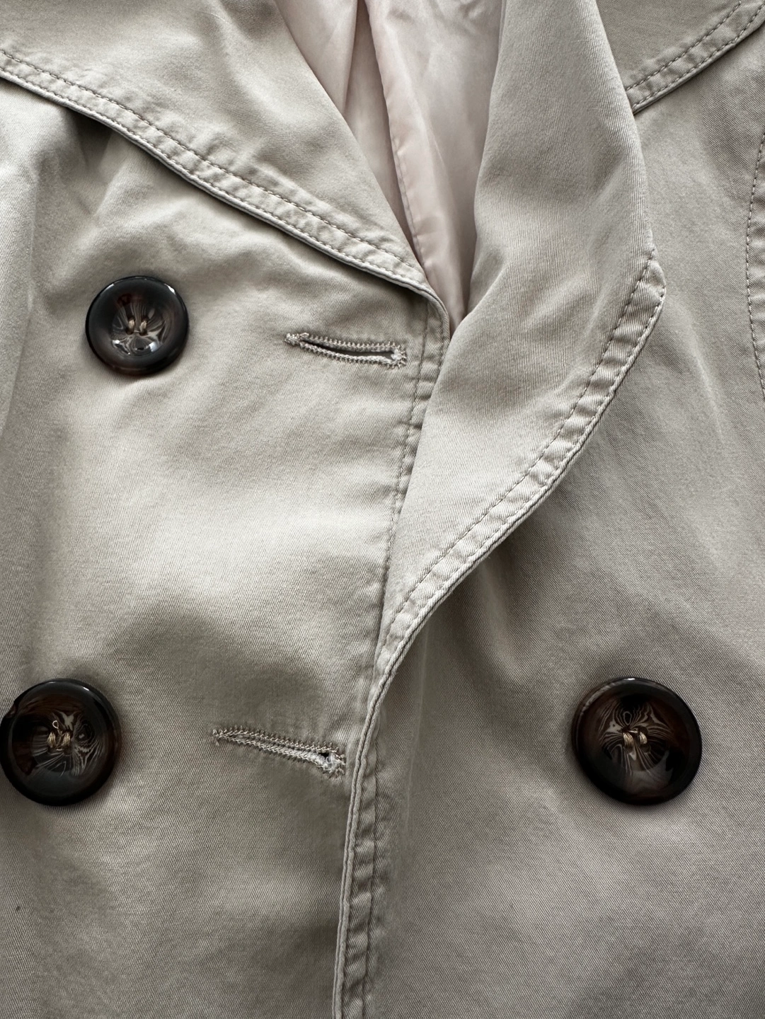 excellent used condition. This pea coat is in a khaki style and is a size small. Super cute buttons down the front as well as pockets on each side. Minor signs of wear include some fading of material or pilling.
