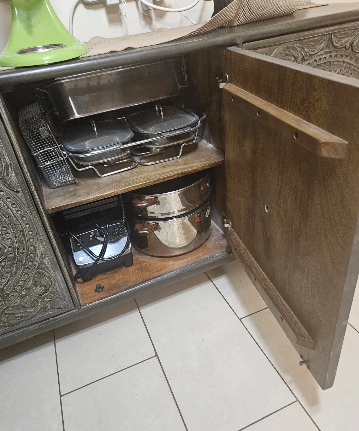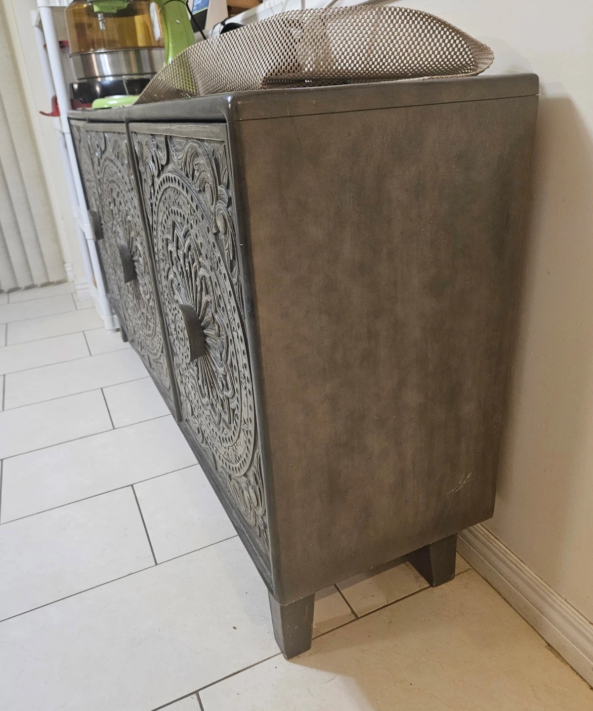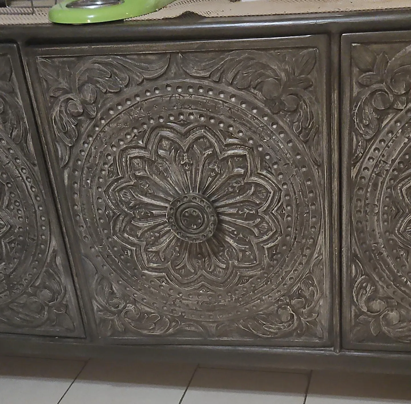 This beautiful sideboard features intricate carved details with a floral medallion design on each door. It's a dark, distressed finish.