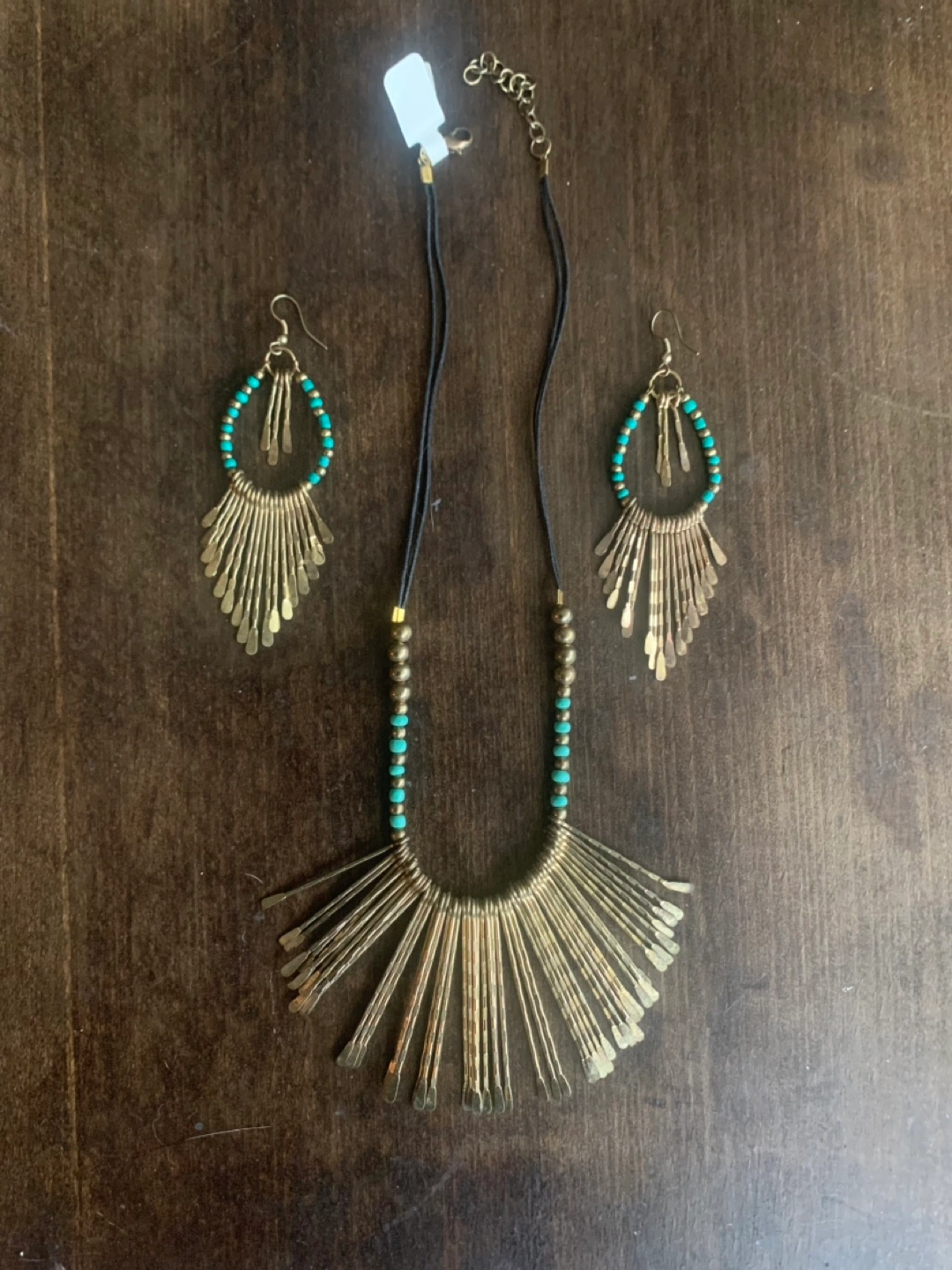 Gold necklace and earrings set with turquoise beads. Necklace has a unique design with many small metal pieces. Earrings are a matching design with a hoop and dangle. This was a gift so I’m not sure of the type of material it is made of.