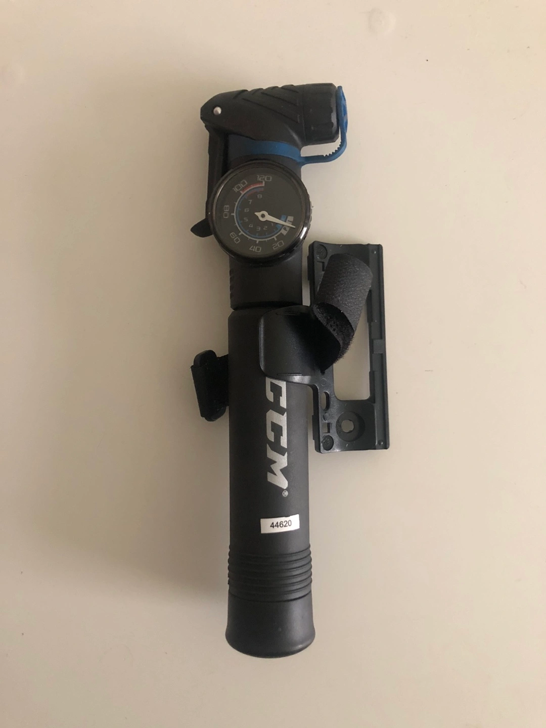 Mini CCM hand bicycle pump with gauge, never used! Black with blue accents. Fits both types of valves.