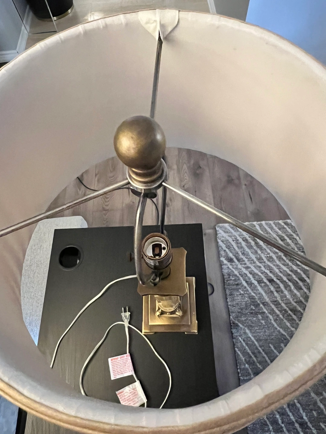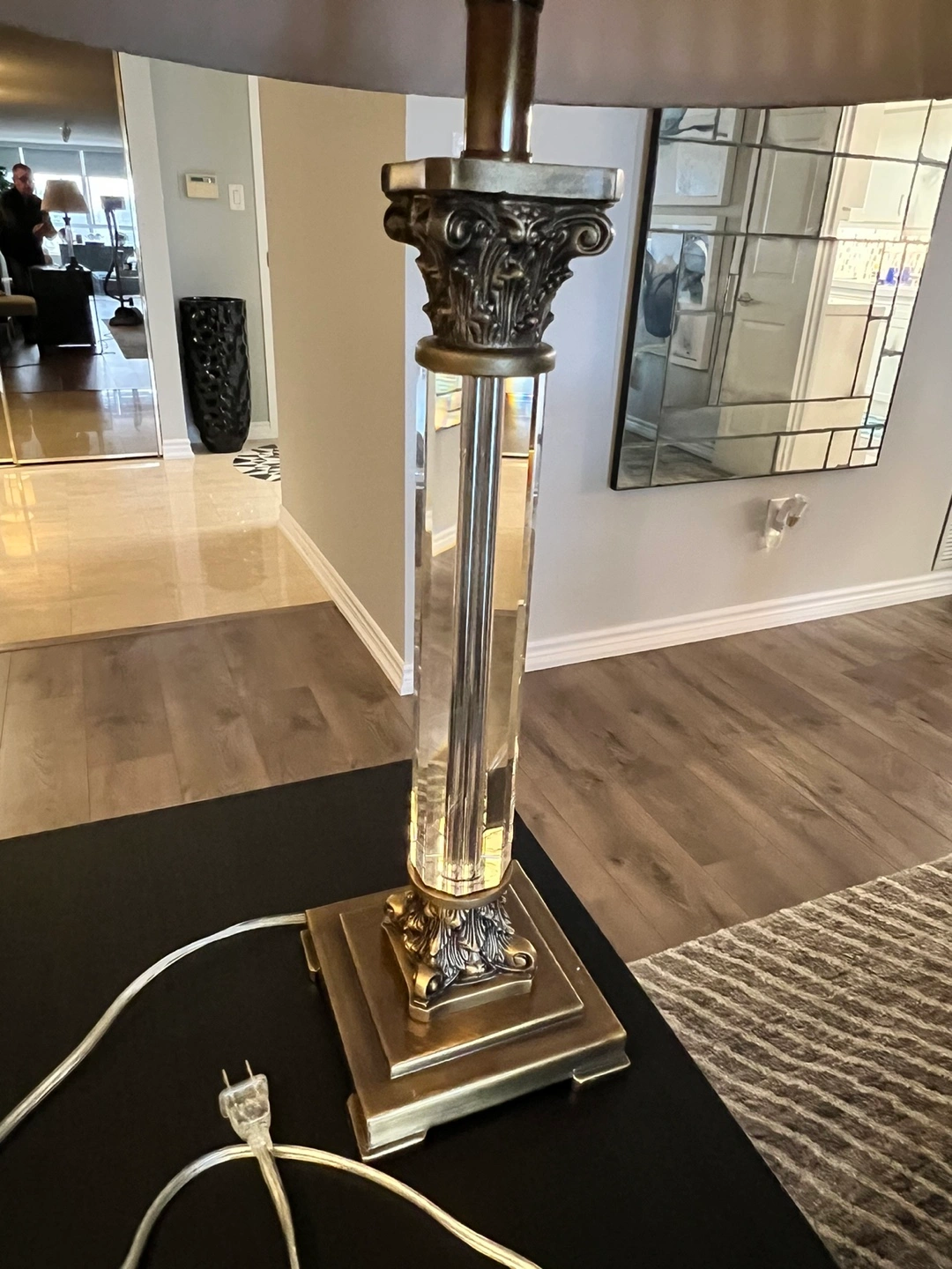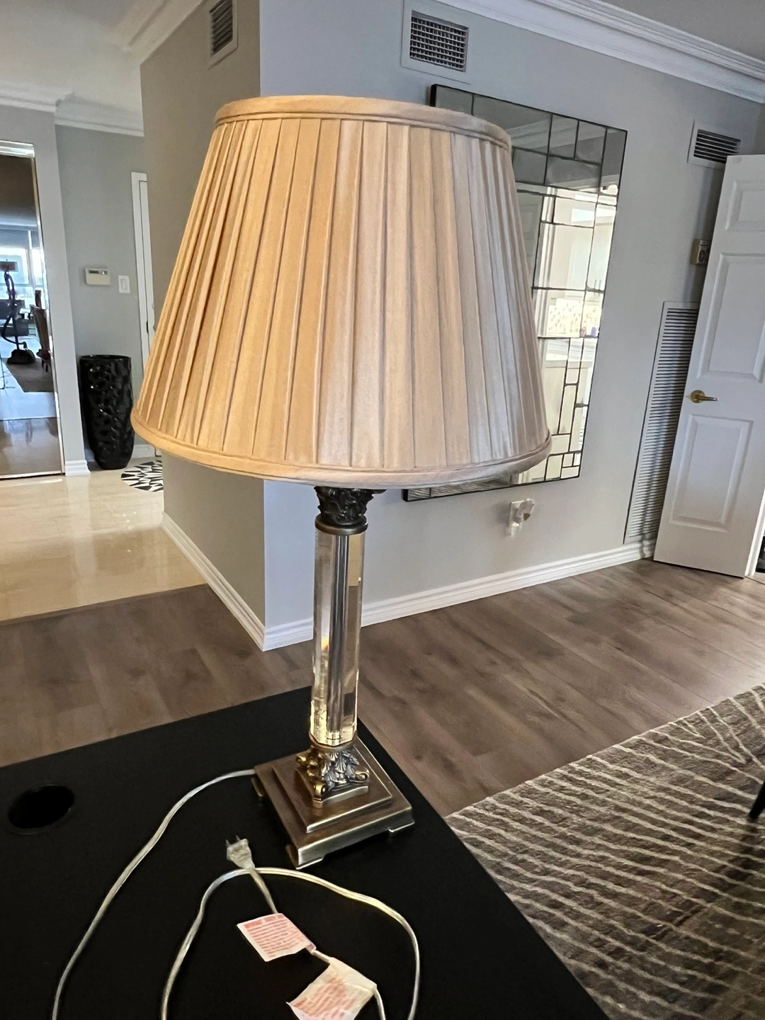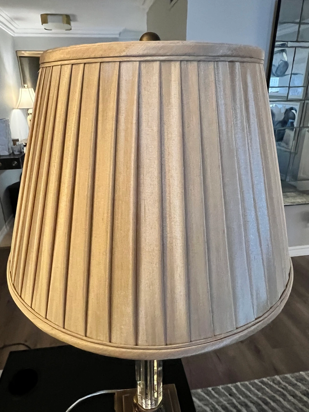Brass and crystal table lamp with a pleated fabric shade. The shade is creamy taupe coloured and has a tri-light on and off switch on luminere.