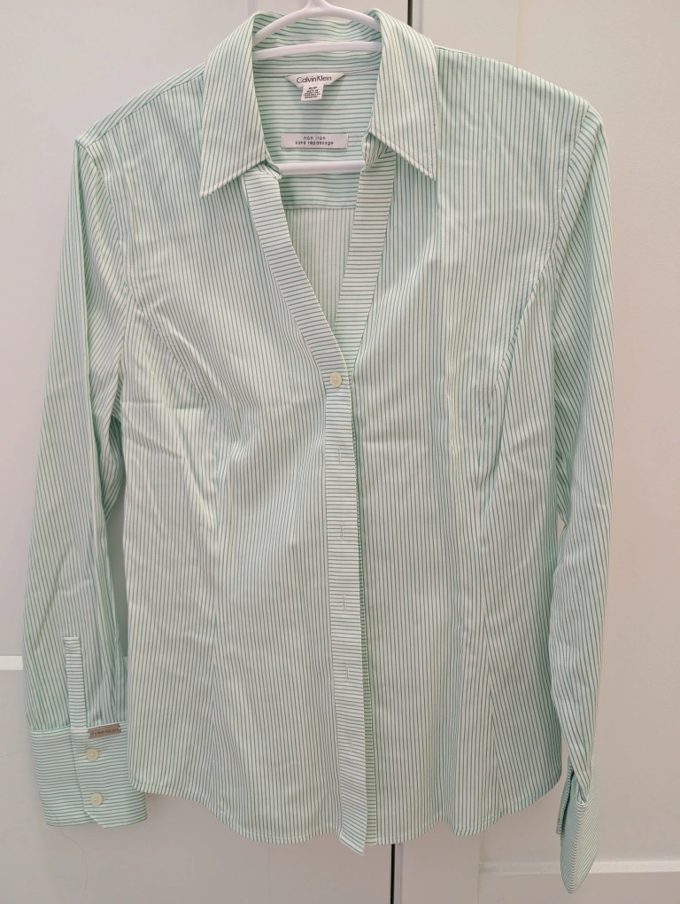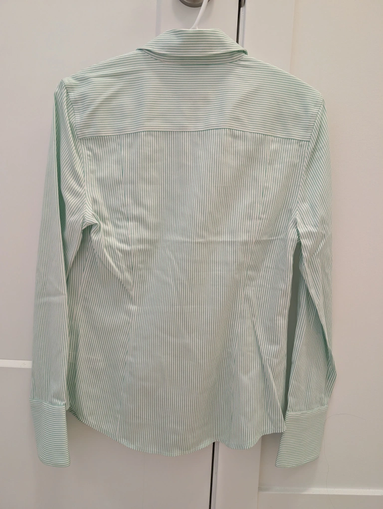 Long-sleeved green and white striped blouse with button-up front. French cuffs with button closures.