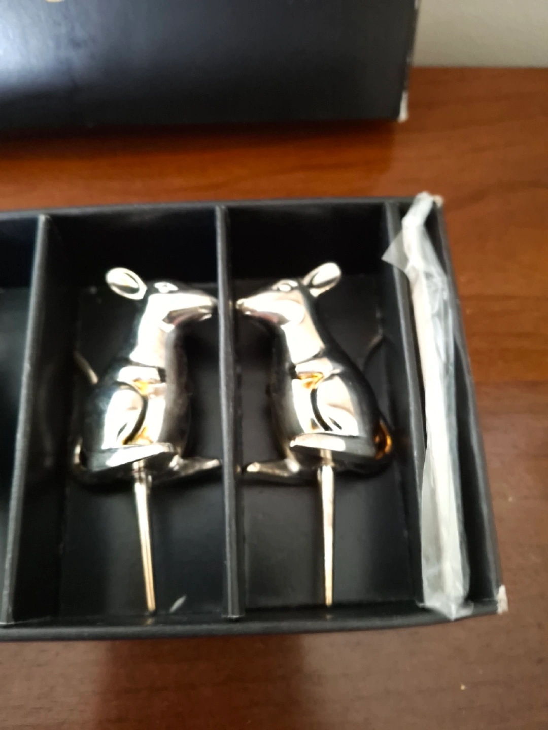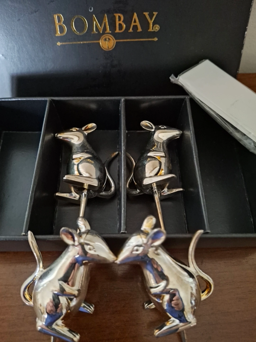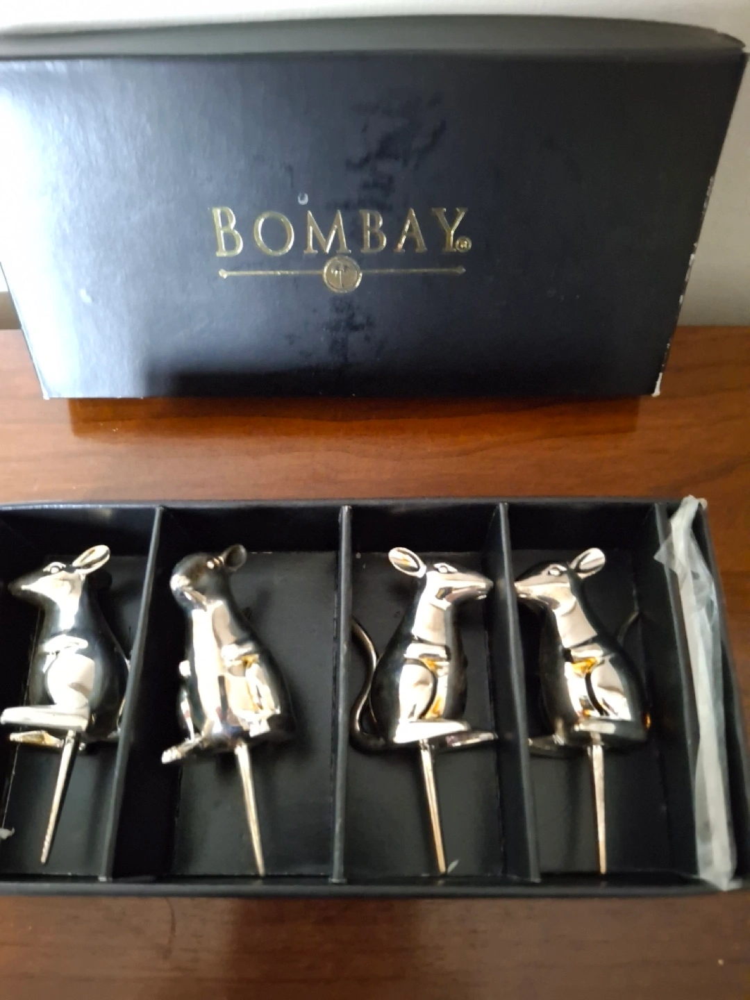Set of 4 Bombay Company mouse shaped cheese markers. They have a slot for cards/labels, great for a charcuterie board. Comes with some cards that have never been opened. Never been used. Have seen them selling elsewhere for $50+ Available for pickup in Markland Wood.