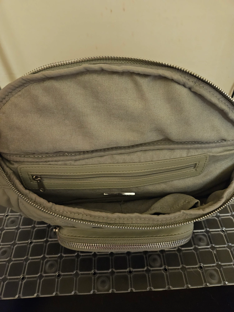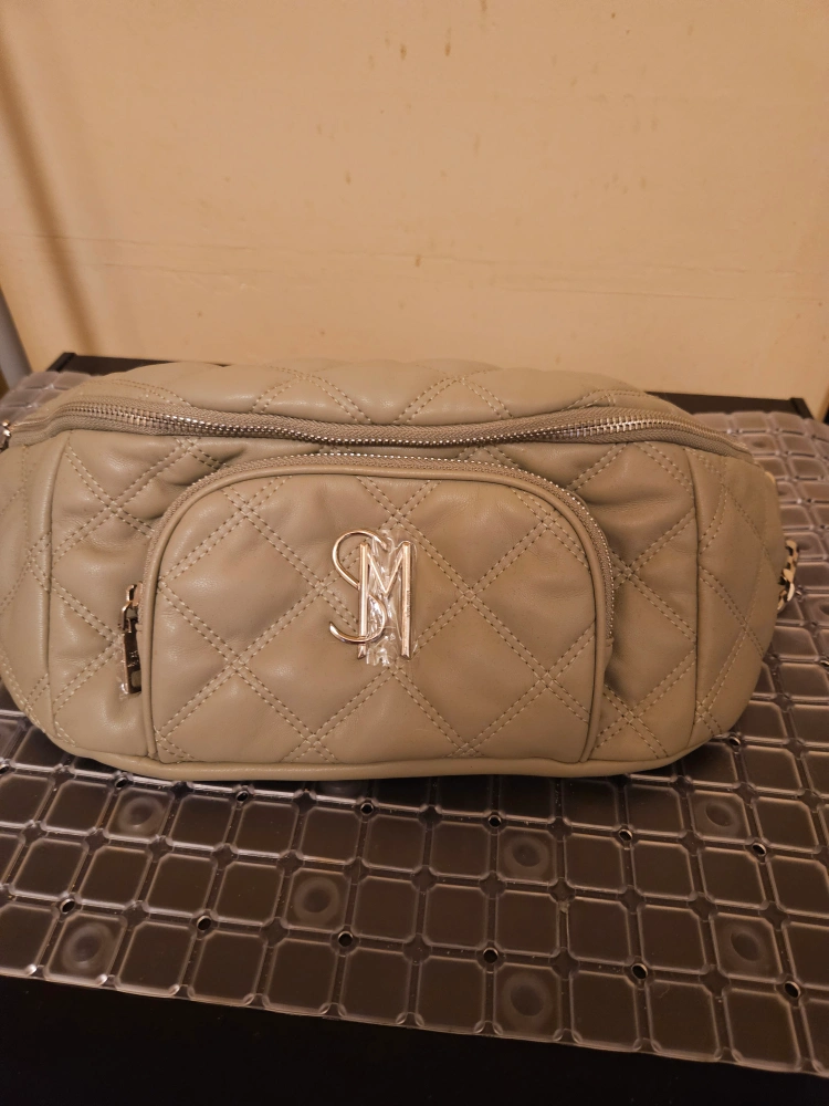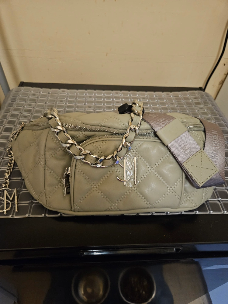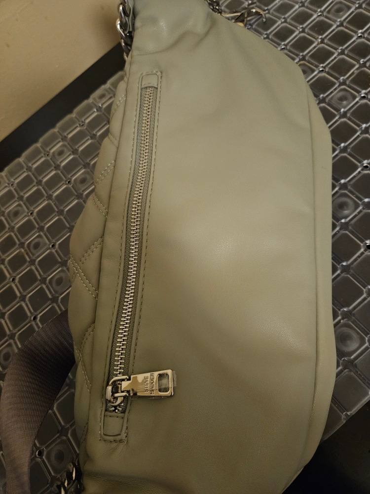 Green quilted fanny pack with a silver chain strap. It has a zip closure and a small pocket on the front.