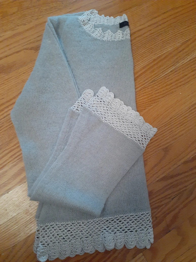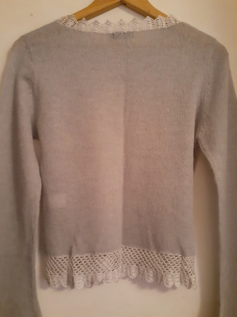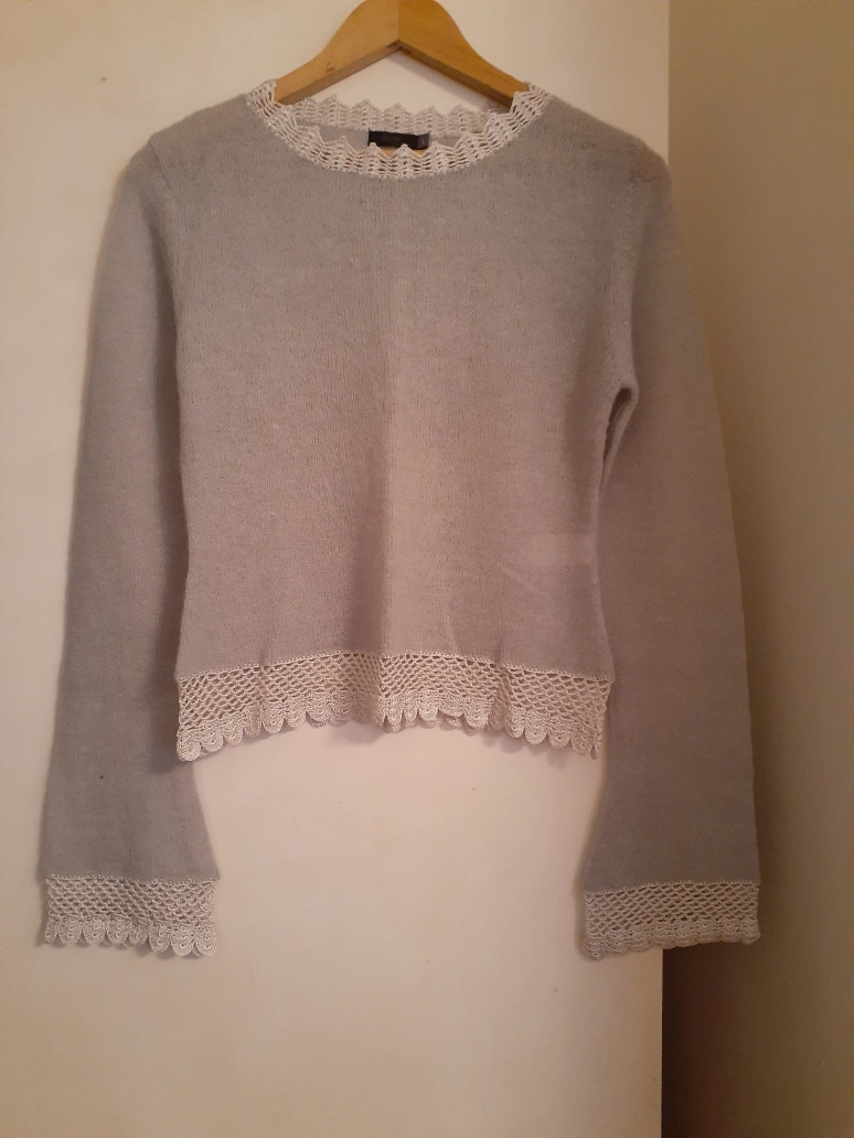 Available! Long-sleeved, delicate and very soft light grey sweater with a lace trim around the neck, sleeves, and bottom. Brand new, never worn. Label says size L but fits more for M Material composition: Mohair 30% Nylon 32% Rayon 20% Acrylic 12% Measurements: Pit to pit 17.5" Collar to Hem 19" Sleeve : 27" No trade Cash and Porch Pickup close to Willowdale middle school OR NorthYork Centre Station/ Empress Walk. PLEASE check distance before responding. Thanks!