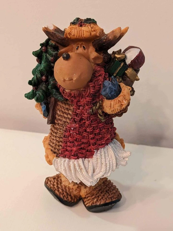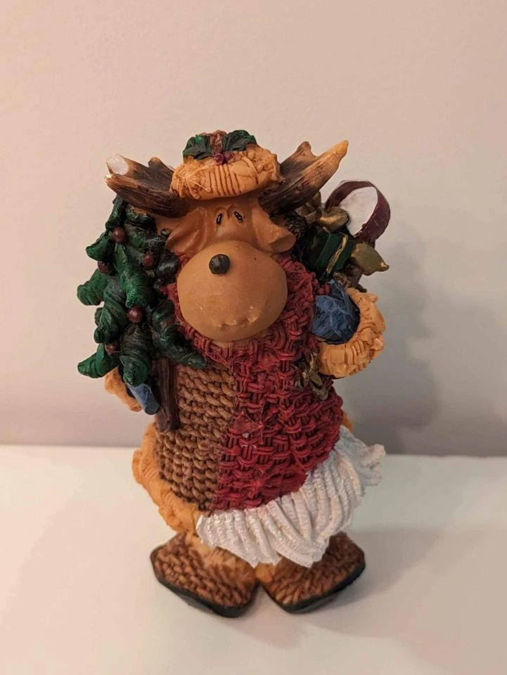 Cute Christmas moose figurine. Wearing a scarf and carrying presents and a Christmas tree. Great for holiday decorating.