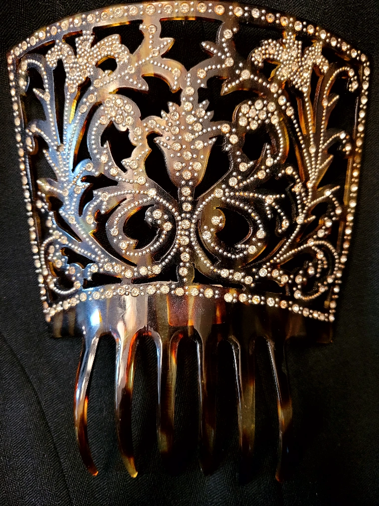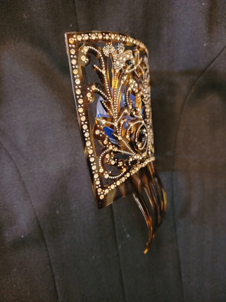 37Traditional Spanish Peineta Large vintage faux tortoiseshell hair comb with rhinestones. Ornate design with six teeth.
