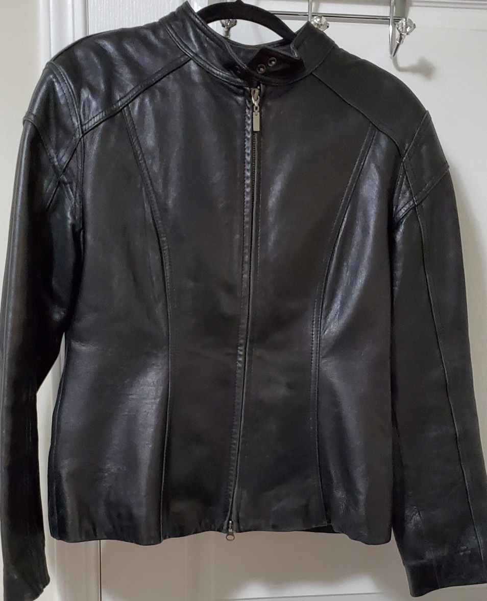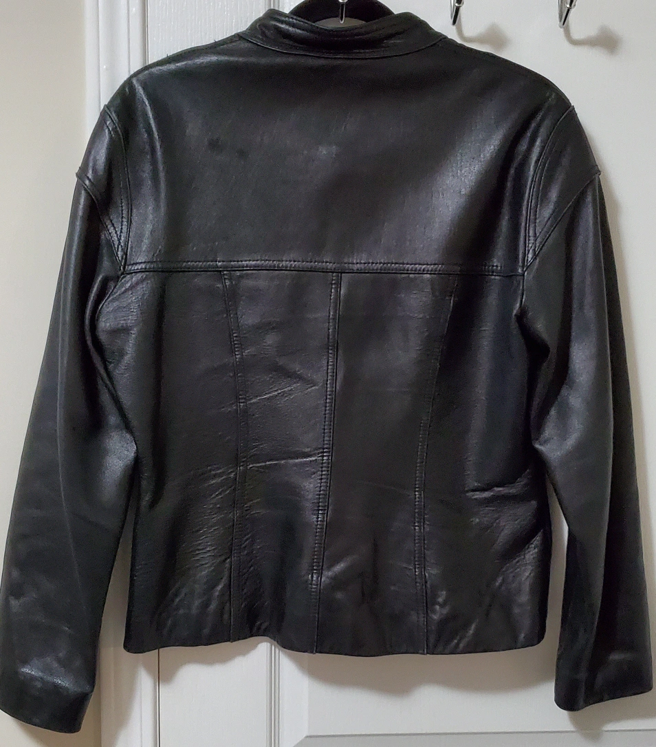 Looking for a dressier moto jacket? Genuine soft leather. Fitted jacket, waist length. Pre-owned, well taken care of. Zipper closure. Two pockets on the front. Color Black.