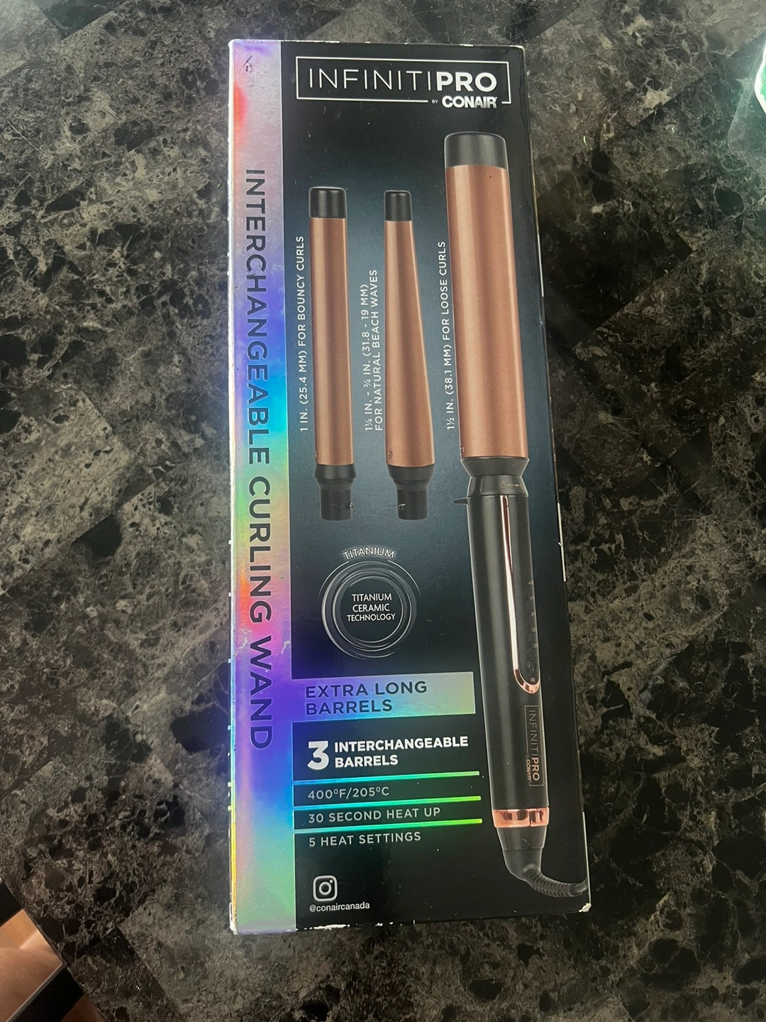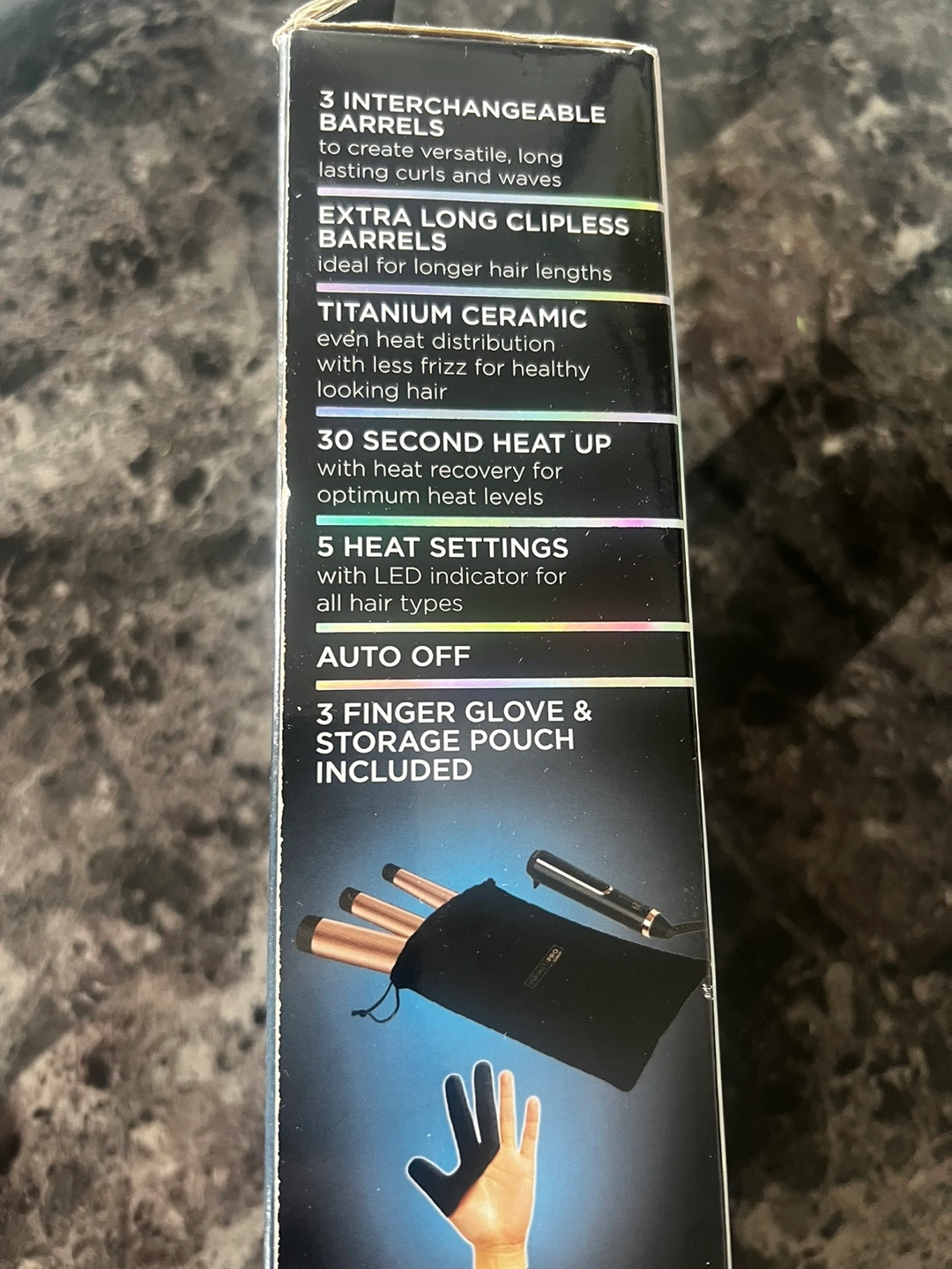 Interchangeable curling wand with three barrels. Extra long barrels, titanium ceramic, 30 second heat up, 5 heat settings.