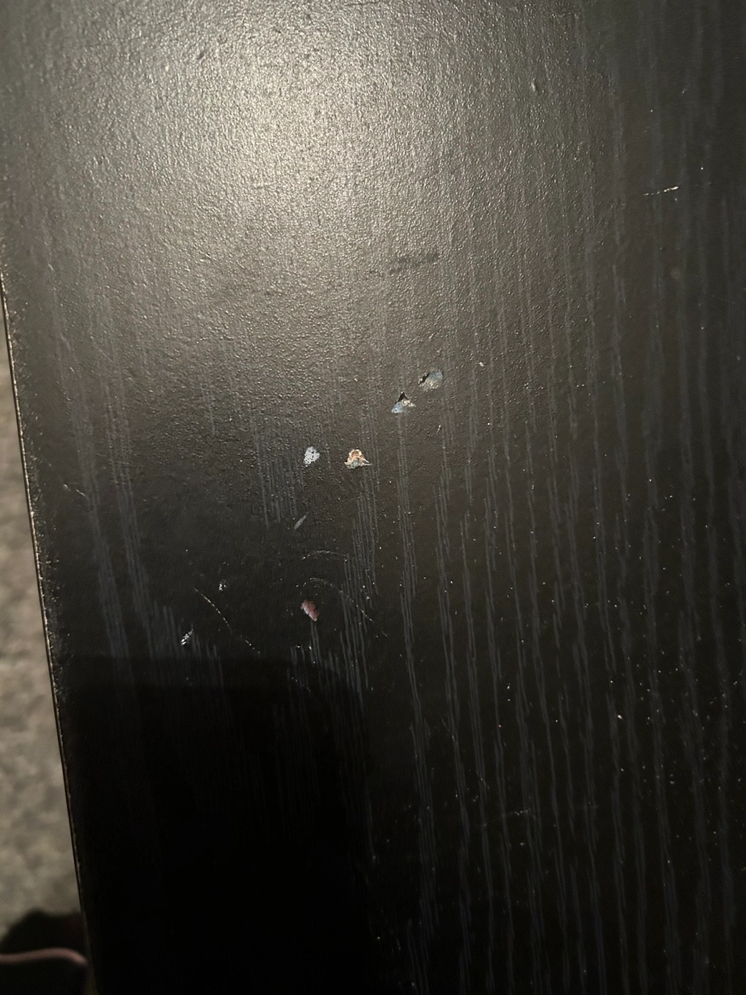 Black coffee table with lift top, perfect for small spaces. Some wear and tear on the top as seen in photo, something fell on it while moving.