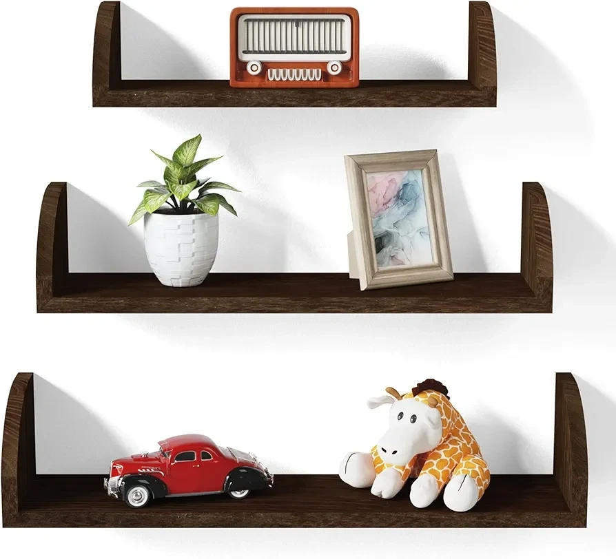 444brand new in the box Rustic Shelves - Made of soild wood, simple and rustic look. Idea for incorporating storage into rooms without a cluttered look, doesn't take up valuable floor space. Multipurpose Floating Shelves - Fill an empty wall to display pictures, small plants, collectibles, and your favorite items in your bathroom, bedroom, living room, kitchen and office. Enhance your decor as well as offering invaluable space to stay organized. Different Display Shelves - Assemble a unique wall display by 3 different size with more creative possibilities. L: 16.7x4.7x4.7in, M: 13.8x4.7x4.1in, S: 9.4x4.7x3.5in. Sturdy Wall Shelves - Attach shelves to wall using drywall anchors and screws to prevent shelves from collapsing due to weight. Max loading weight is 17lbs. What You Get - Turning your empty wall into beautiful pieces of artwork for your home