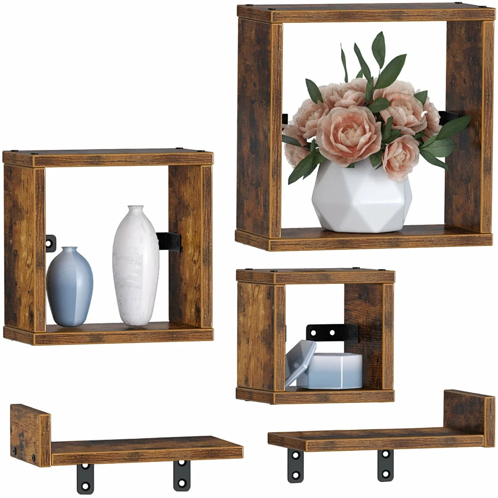 444Brand new in the box Set of 5 wooden floating shelves. Includes 3 cube shelves and 2 rectangular shelves. Rustic Display Floating Shelf Set-Bring function and farmhouse flair with this hanging shelf set. The clean-lined piece features a rustic brown finish for a tone from bygone times. Renovate your living room, bedroom, study, foyer, bathroom or coffee corner with these storage floating shelves. Vintage style is perfect for all types of rooms and furnishings. Versatile Decorative Wall Shelves-Set of 5 shelves including 3 cube shelves( 5in/ 7in/ 9in) and 2 L shelves( 8.3’’L x 3.9’’ W). Add additional shelving space to store, display and organize your items like books, clocks, arts, plants, photos and etc. The maximum loadable weight each cube shelf can bear is 17.6 lb. Sturdy & Creative Wall-mounted Set-Different sizes and shapes design is to provide more choices for your layout. Choose your favorite look and create your own personal style. The raw materials used by Rolanstar meet the EPA TSCA Title VI and Carb Certification. Offering you a safe and healthy living environment. Easy & Fast Setup and Clean-By Following the instructions and using the tools provided(Wall Anchors Screws/Bubble Level), an assembly can be completed within 25 mins. Melamine veneer, waterproof, heat-resistant and dust-free means you only need a damp cloth to keep it clean.
