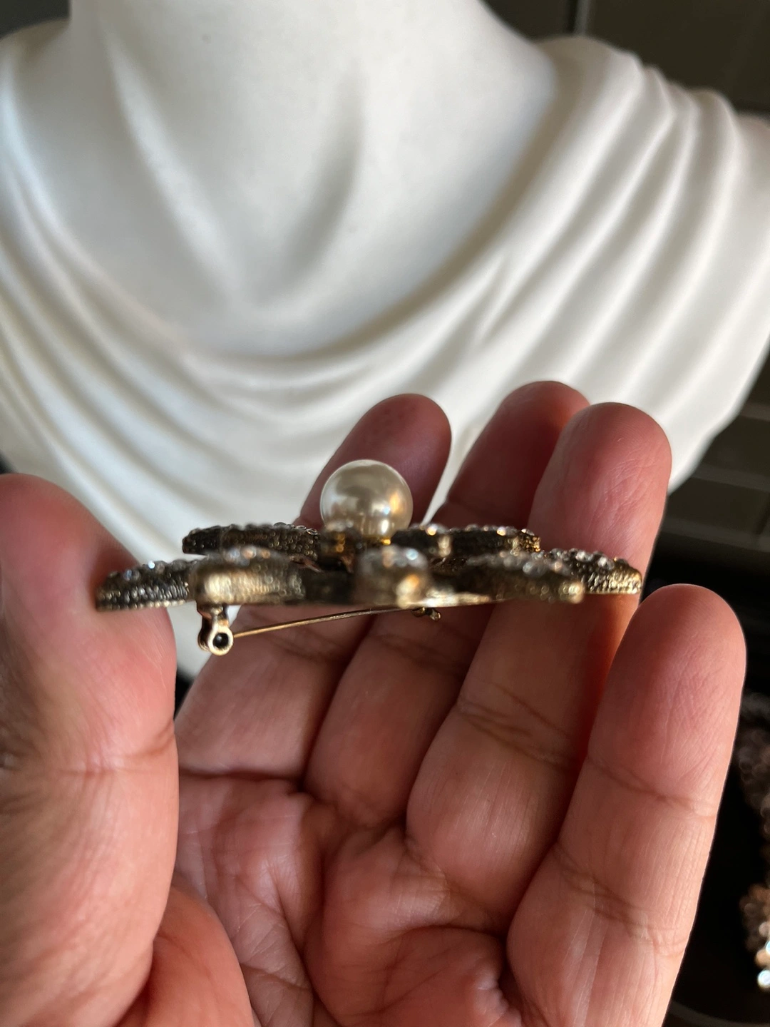 Vintage Gold Tone Flower Brooch with Pearl and rhinestones