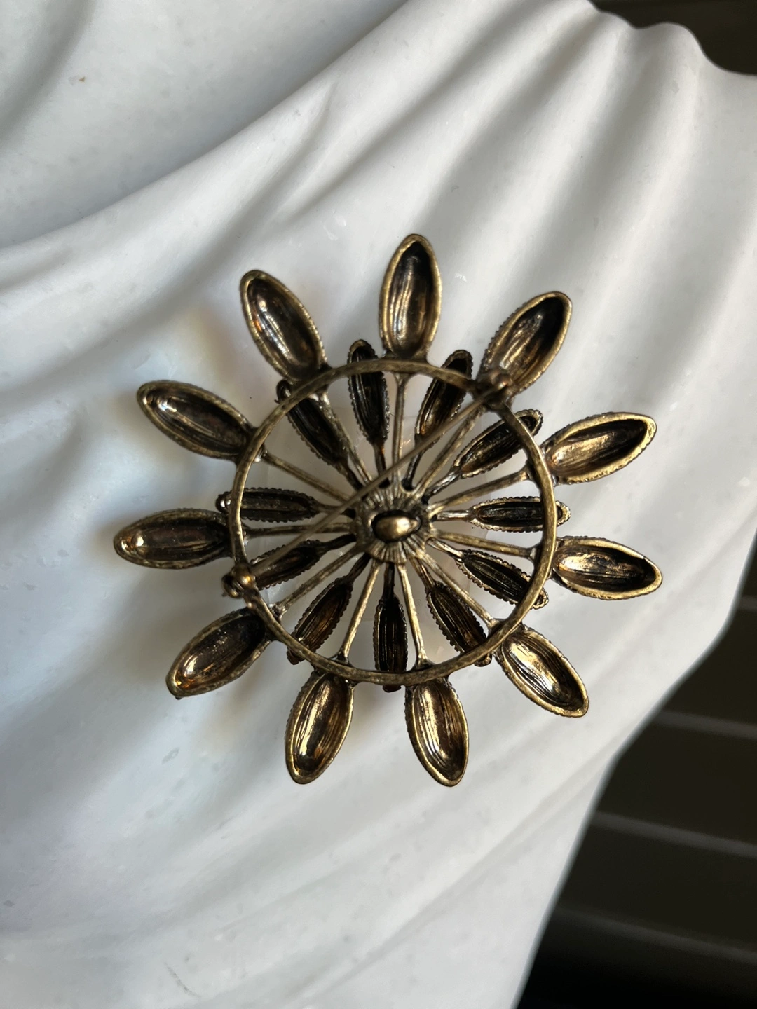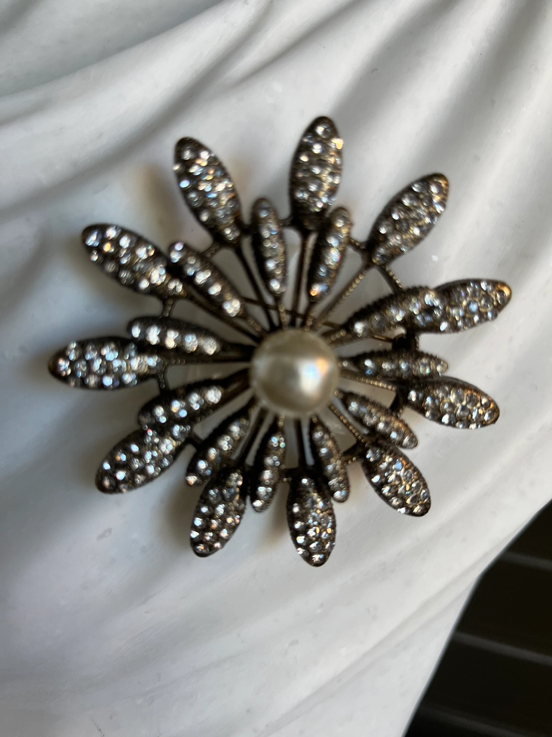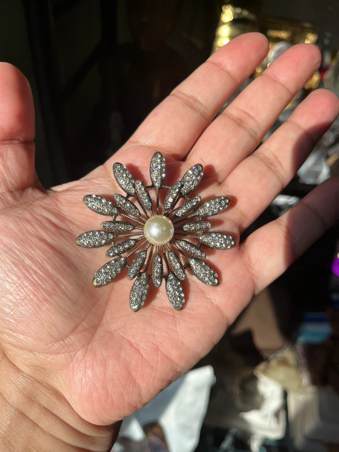 Vintage Gold tone brooch with a large pearl in the centre. The brooch is in the shape of a flower with many petals and crystals. There are rhinestones on the petals. Brooch is in good condition.
