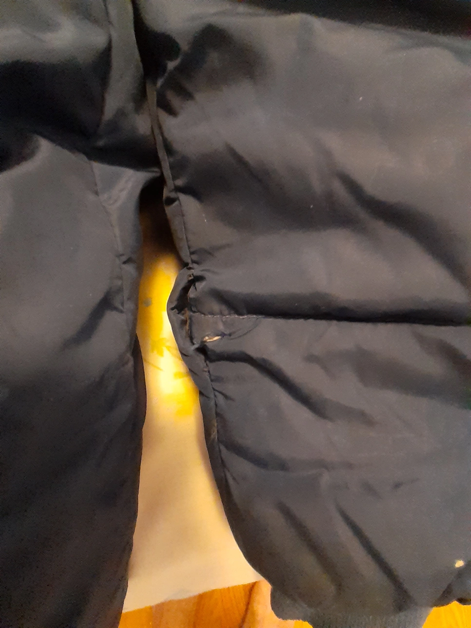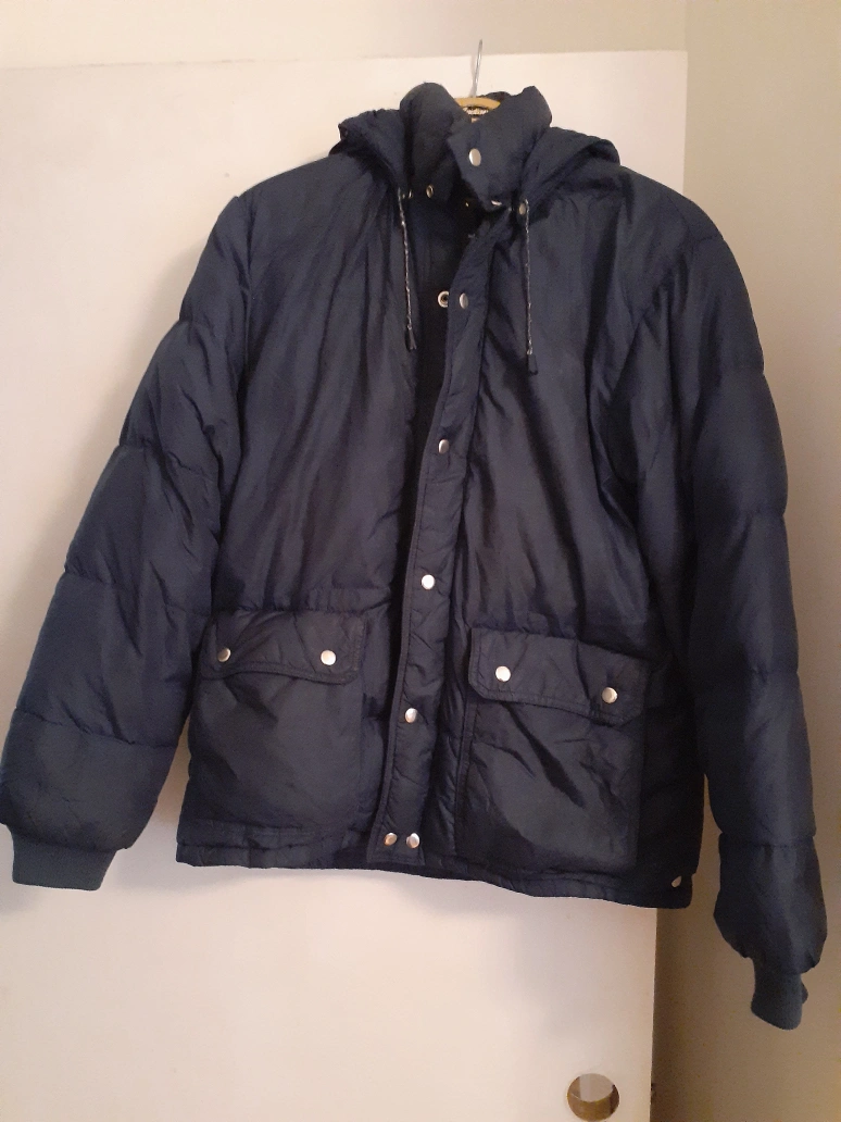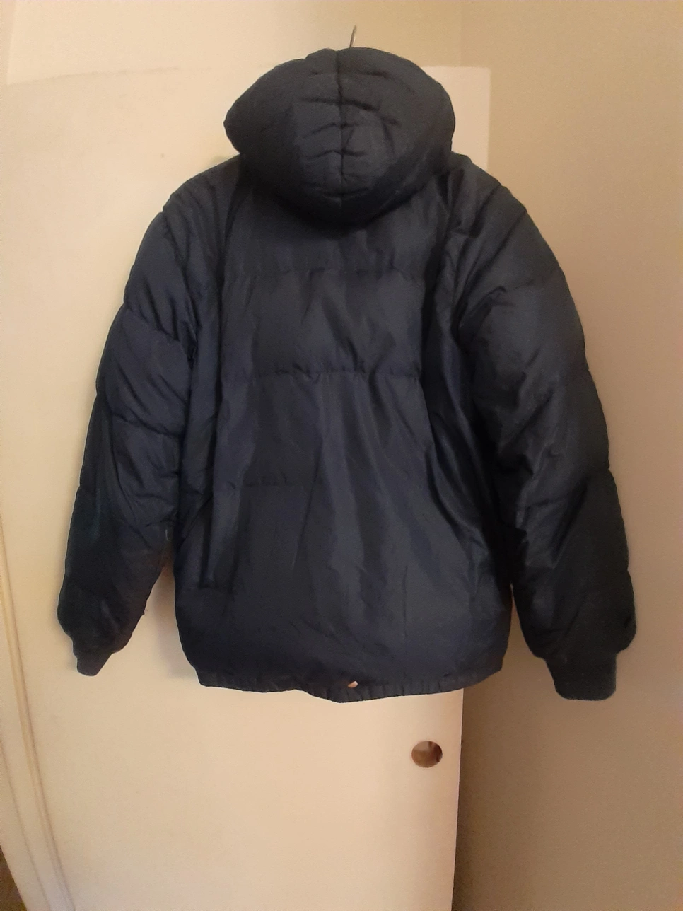 Mens dark blue down puffer jacket. Has a detachable hood. Features a zipper and button closure. Has two front pockets. There is a small tear near the bottom of the jacket and seam of 1 pocket is off. No size tag. Fits M Sold As Is Cash and Pickup close to Willowdale middle school OR NorthYork Centre Station/ Empress Walk.