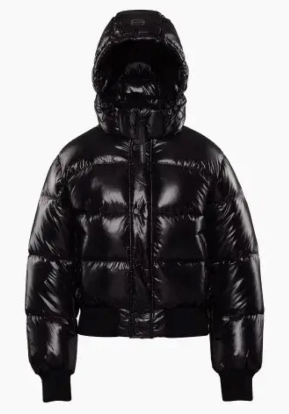 Shiny black puffer jacket with a hood.