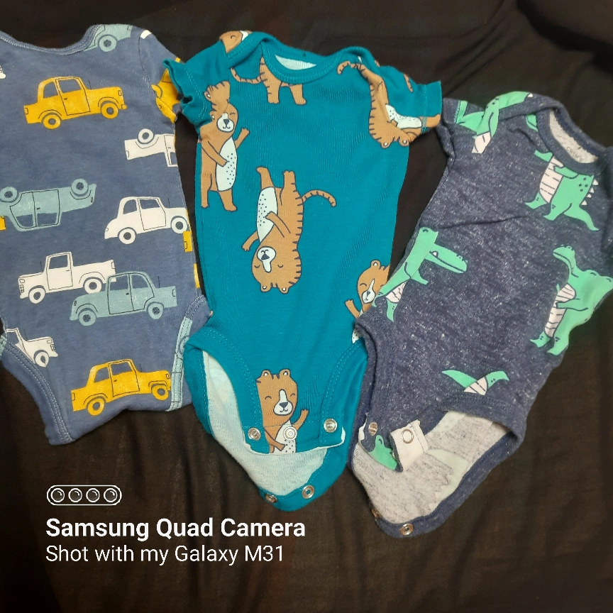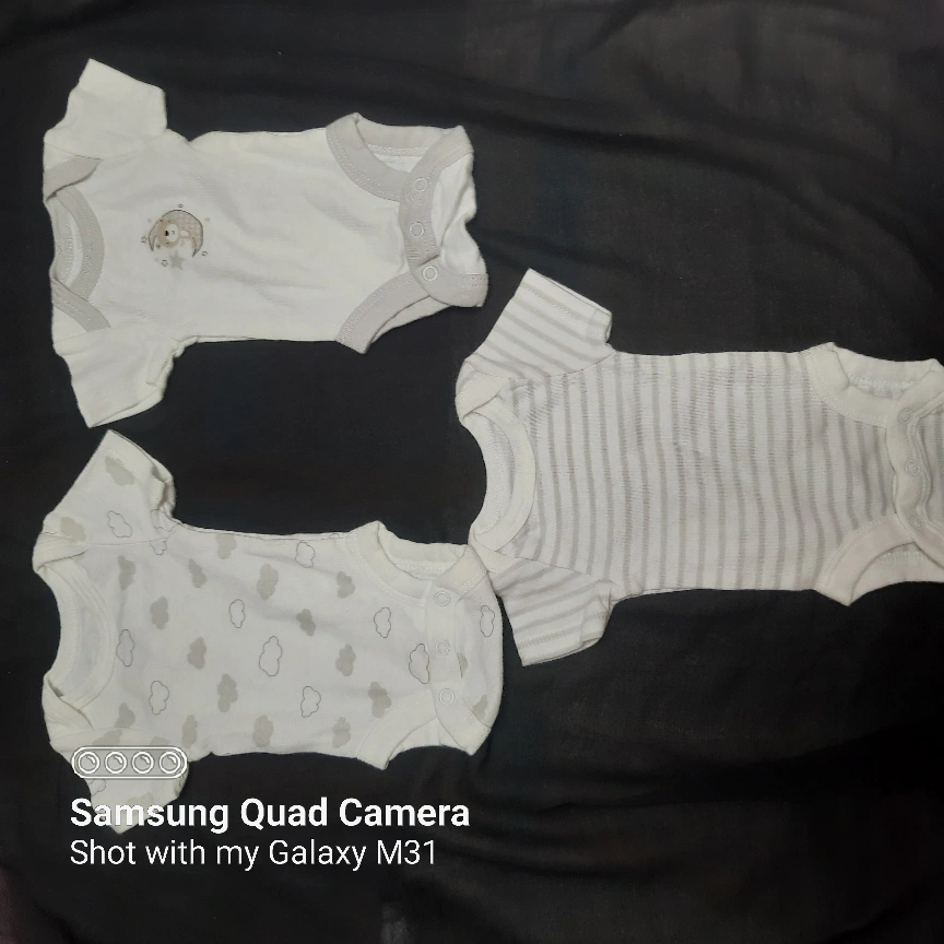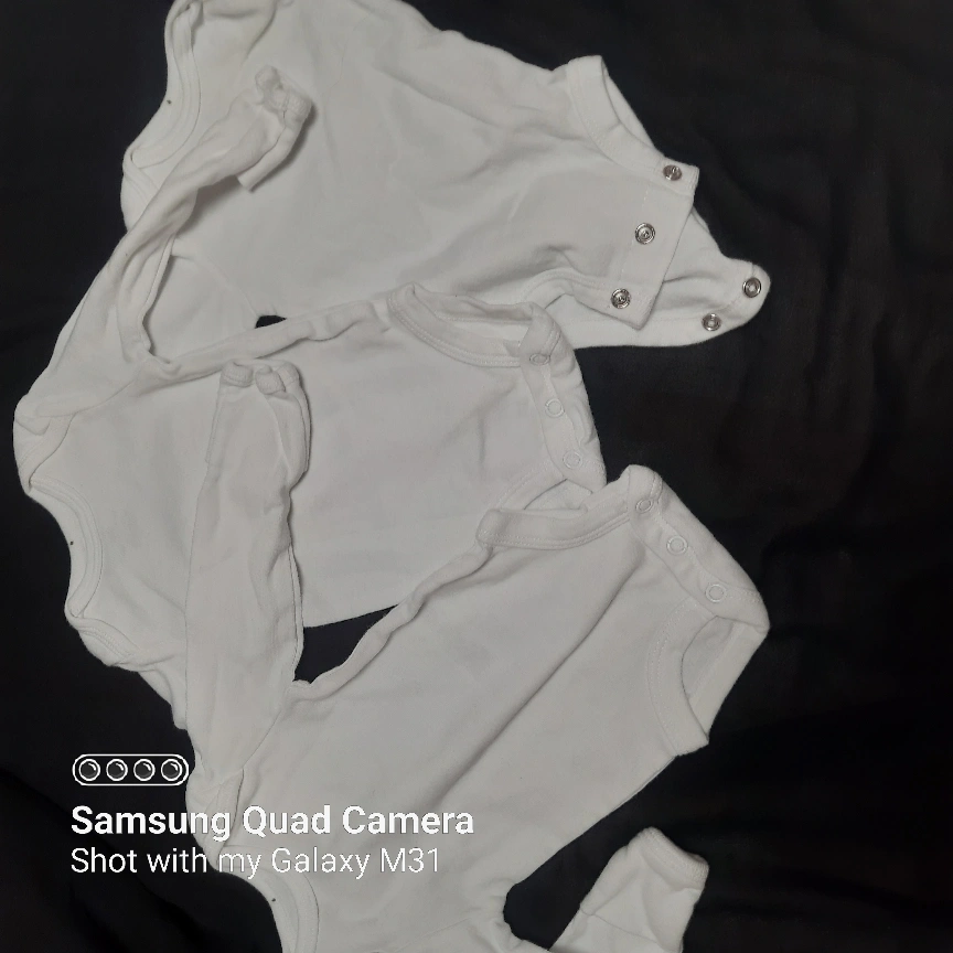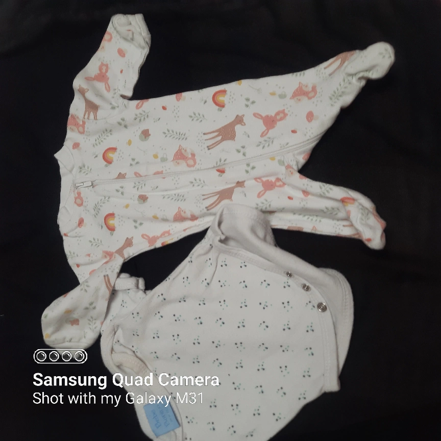 Bundle of 10 baby clothes. Includes bodysuits, long-sleeve shirts, and a sleeper. All items are in good condition. some are never used.