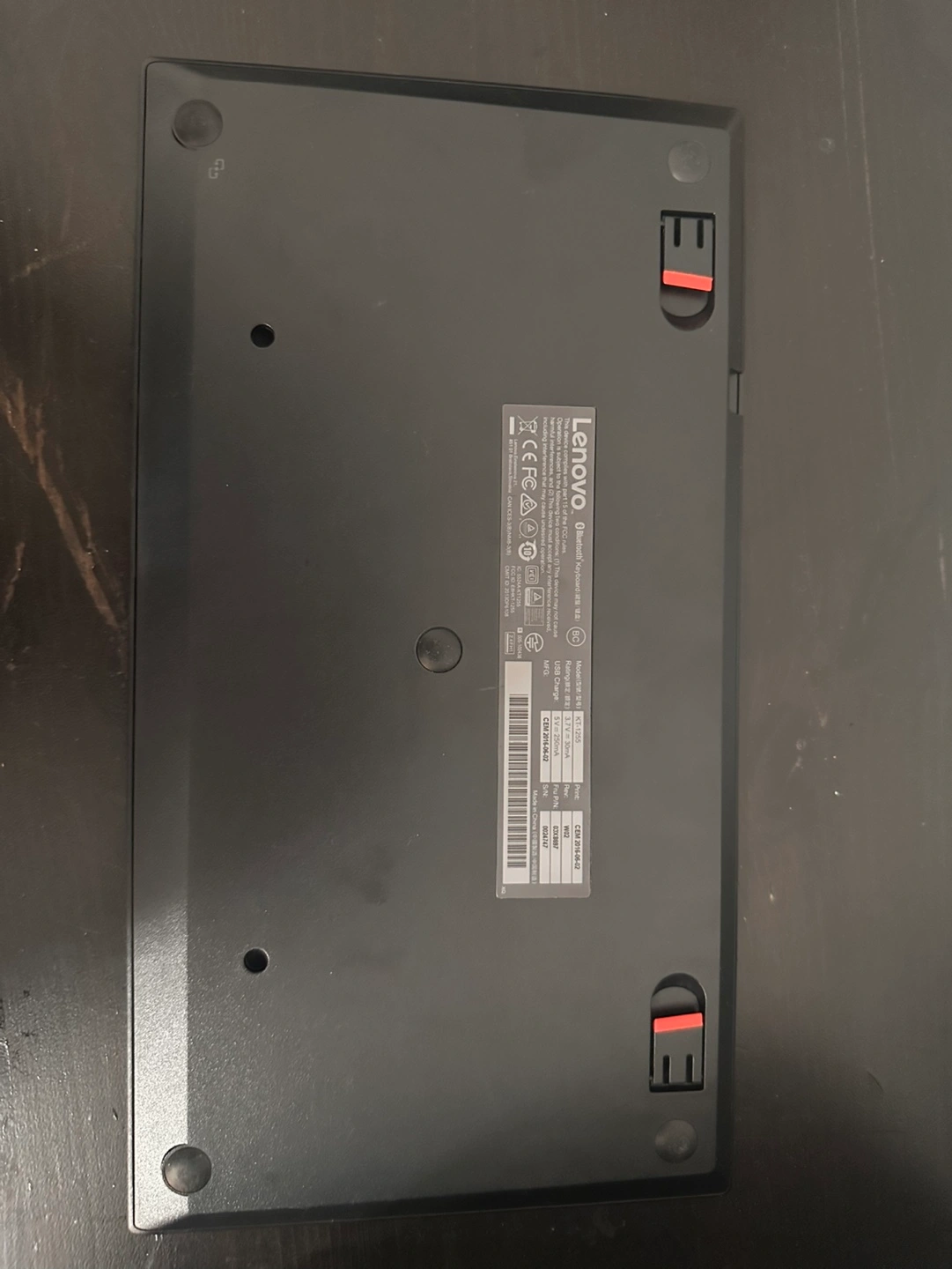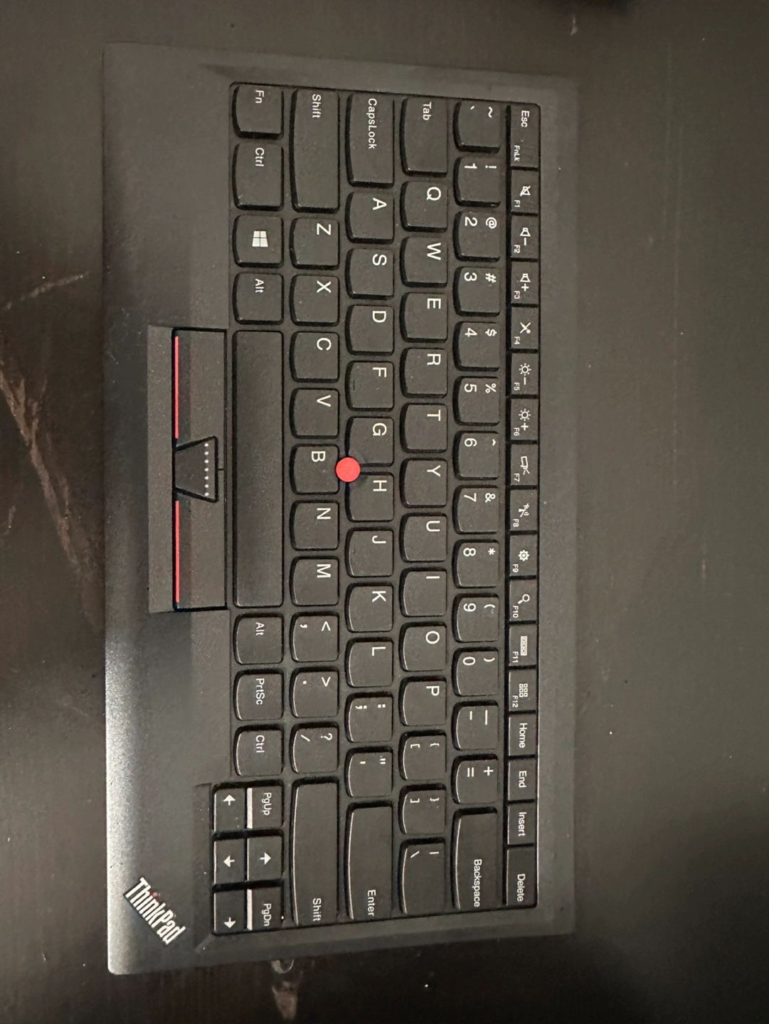 Black keyboard with red trackpoint. Connects via Bluetooth can connect 3 devices simultaneously