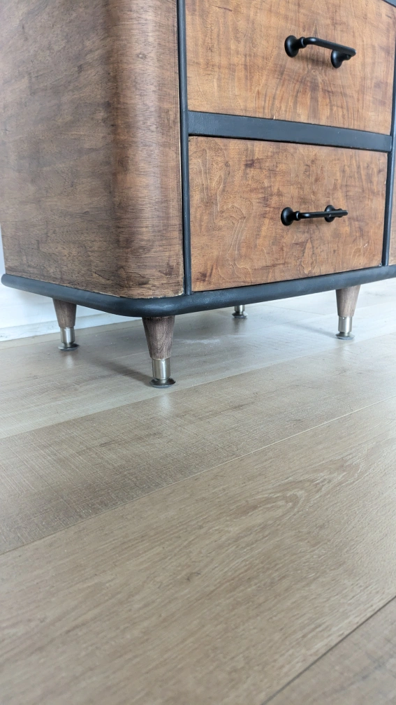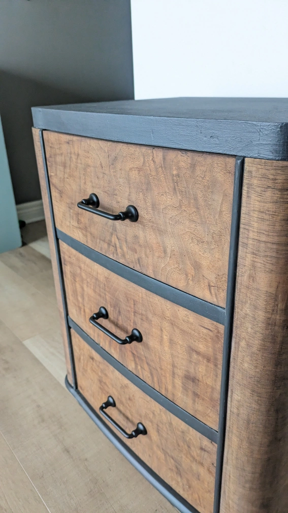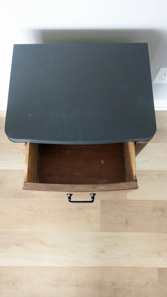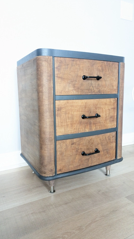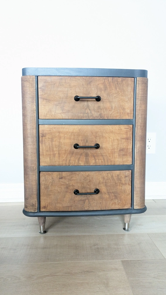 MCM 3 Drawer nightstand, dark charcoal & walnut finish with tapered legs Measurements: Length: 18" Depth: 14" Height: 25" Pick up preferred, drop off available for additional fee depending on location