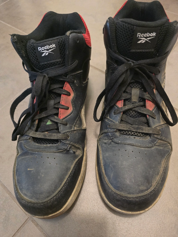 Black and red high top work sneakers, size 10.5W. Men's work boots. They have a composite toe, electrical shock resistance, puncture resistance, and a metal free outsole. They have been worn but are still in good condition.