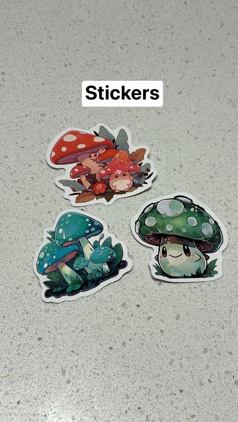 687Three mushroom stickers. Two green mushrooms and one red mushroom cluster. Pick up at Dundas and River