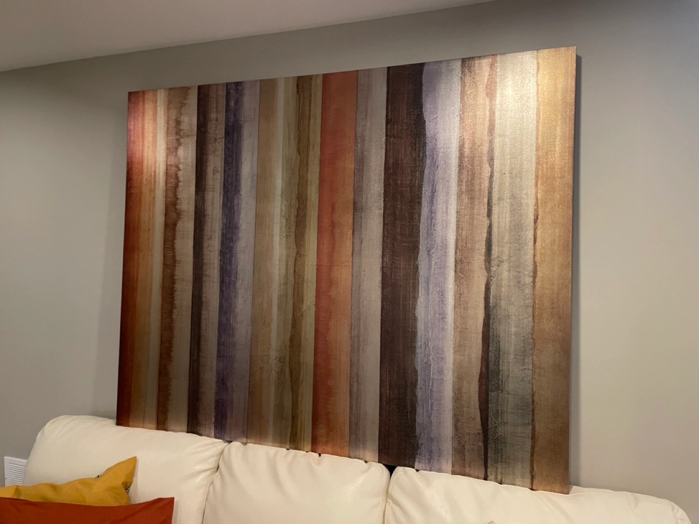 Stunning metallic statement piece. 48 x 60”. (4’ x 5’). Well supported on the back. Fairly lightweight, it just needs to fit in your vehicle.