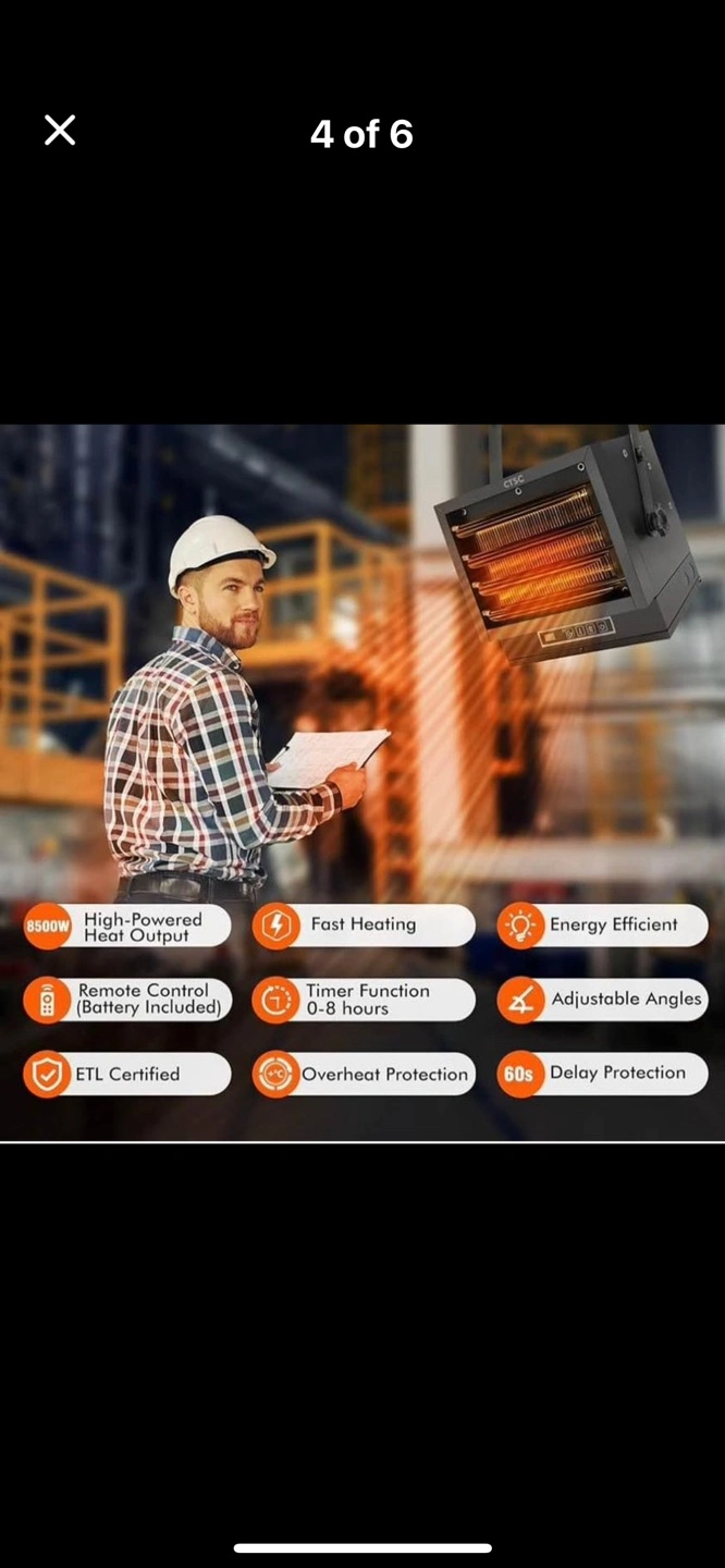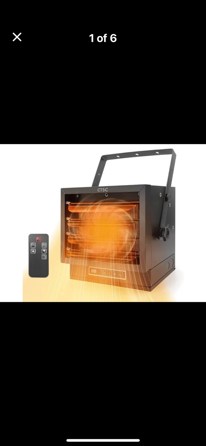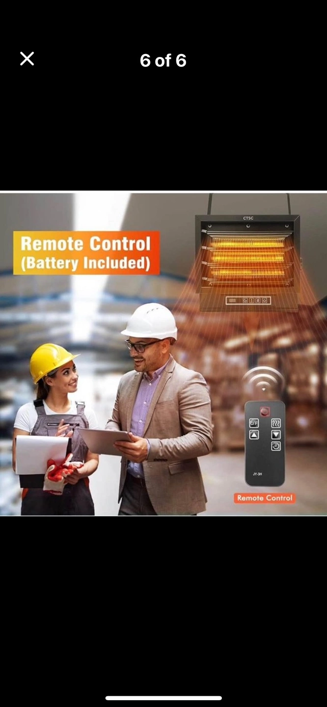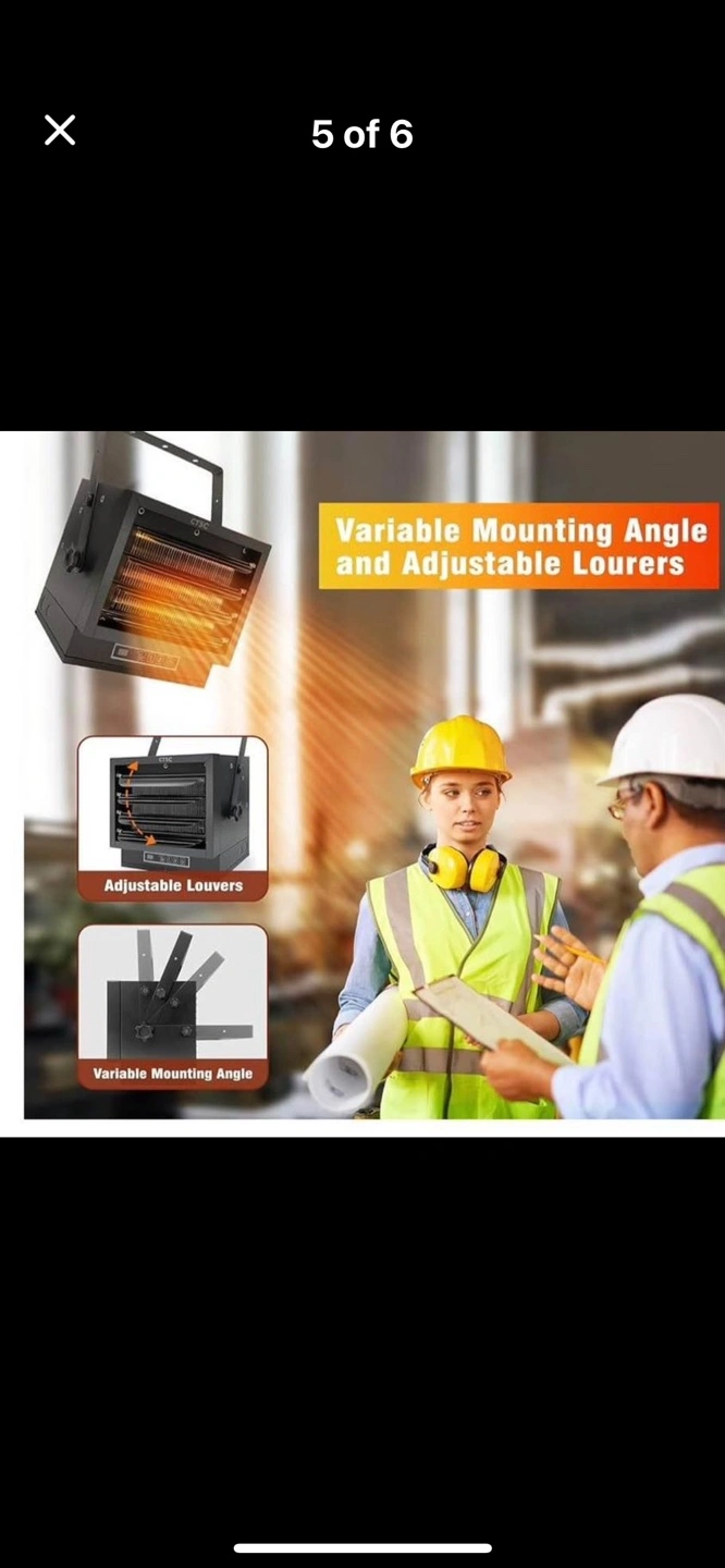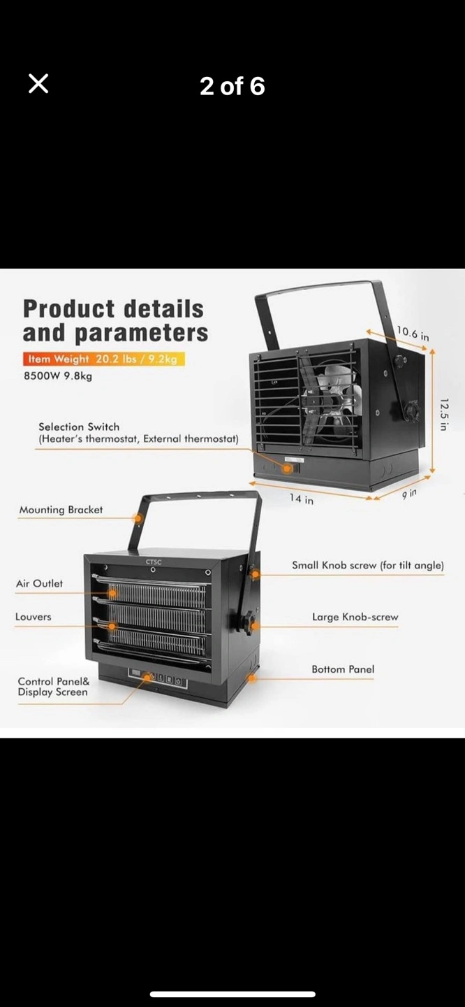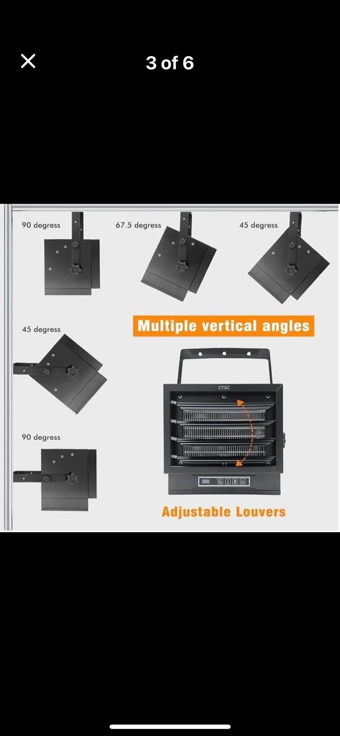 ETL certified. Electric heater 7500w with remote control, adjustable louvers and adjustable vertical angle. Includes mounting bracket. Has thermostat and a display screen. The heater is black in colour. Remote also included.
