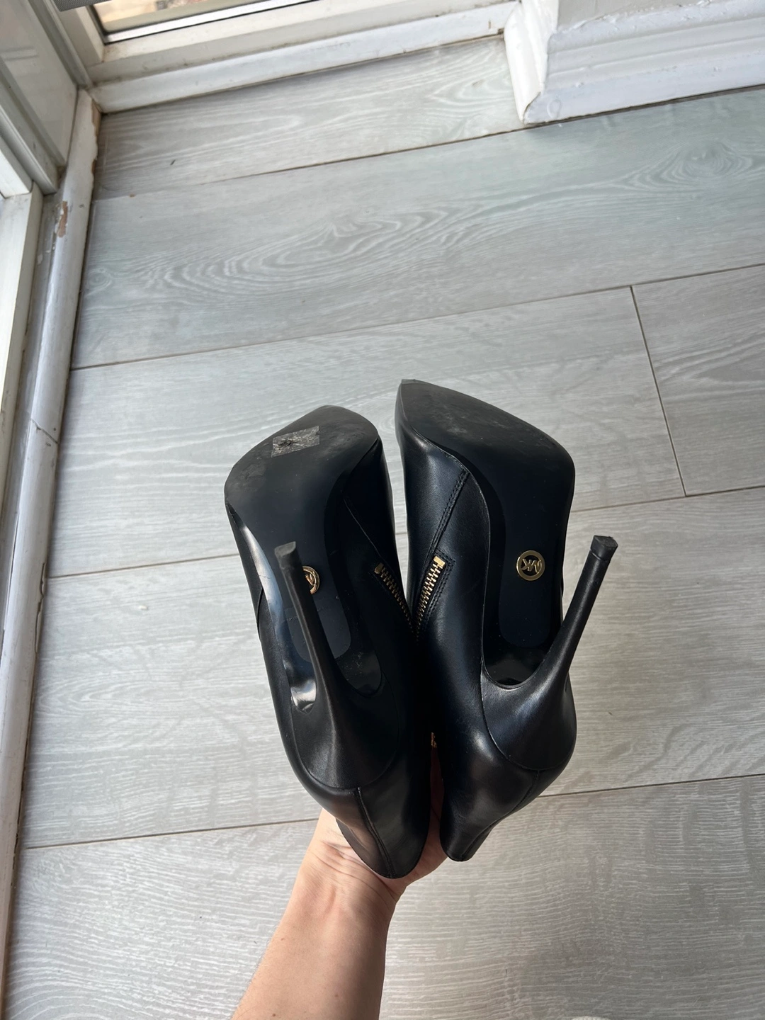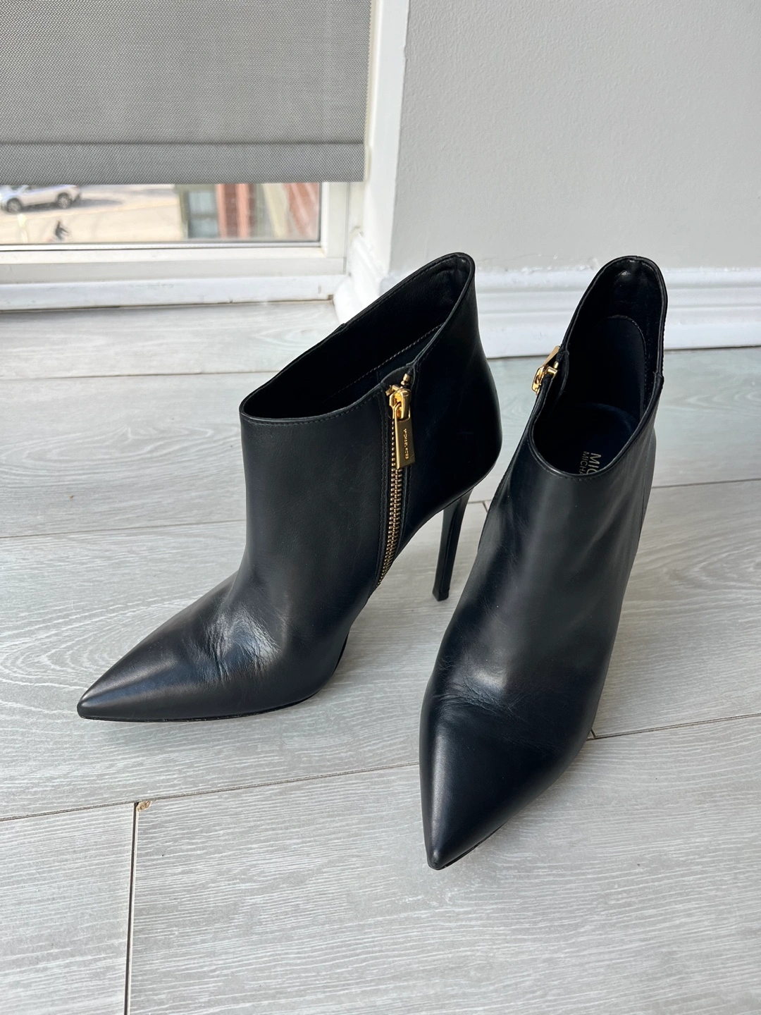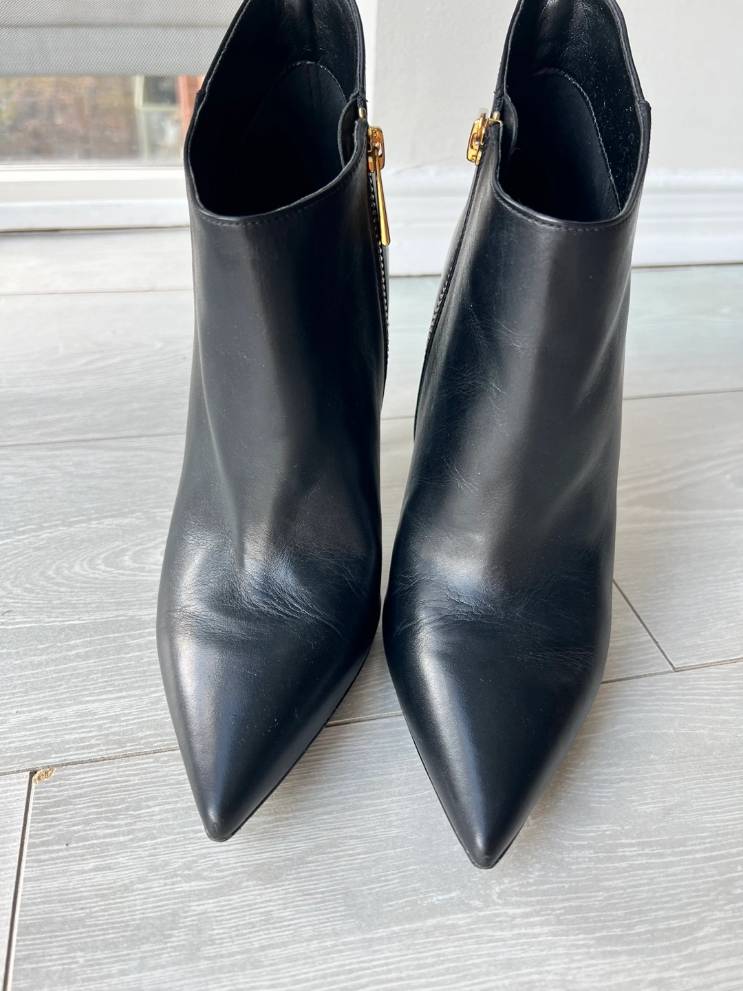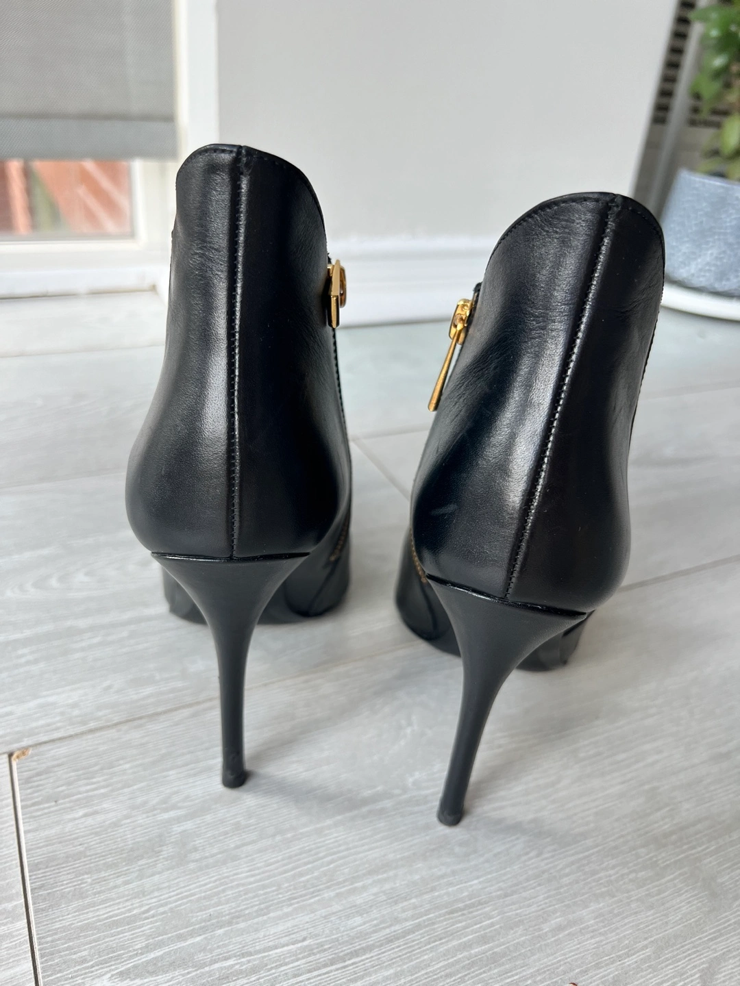 Black leather booties with gold zipper and stiletto heel 4 inch.