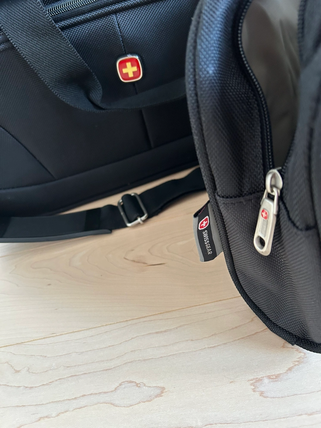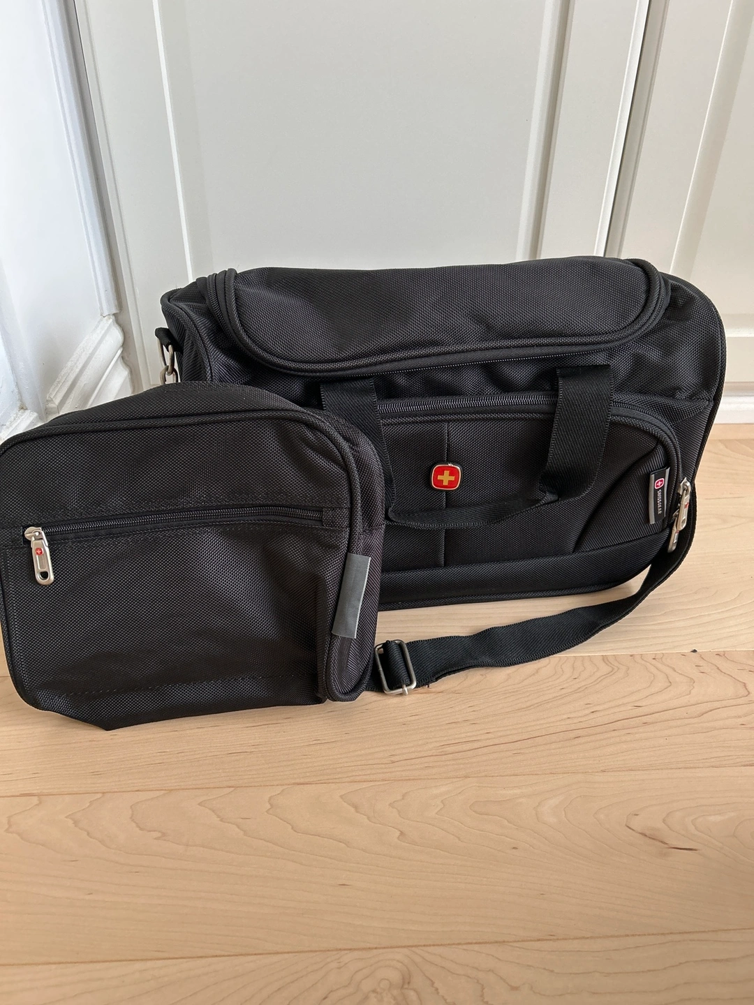 NEW/ NEVER USED SwissGear carry on black duffle & toiletry bag Comes with a shoulder strap and includes zippered pouches on the outside and a mesh section inside. 16.5” long 11.5 tall 7” wide