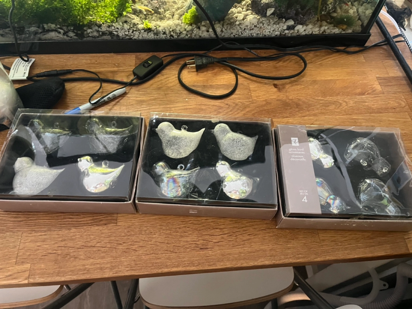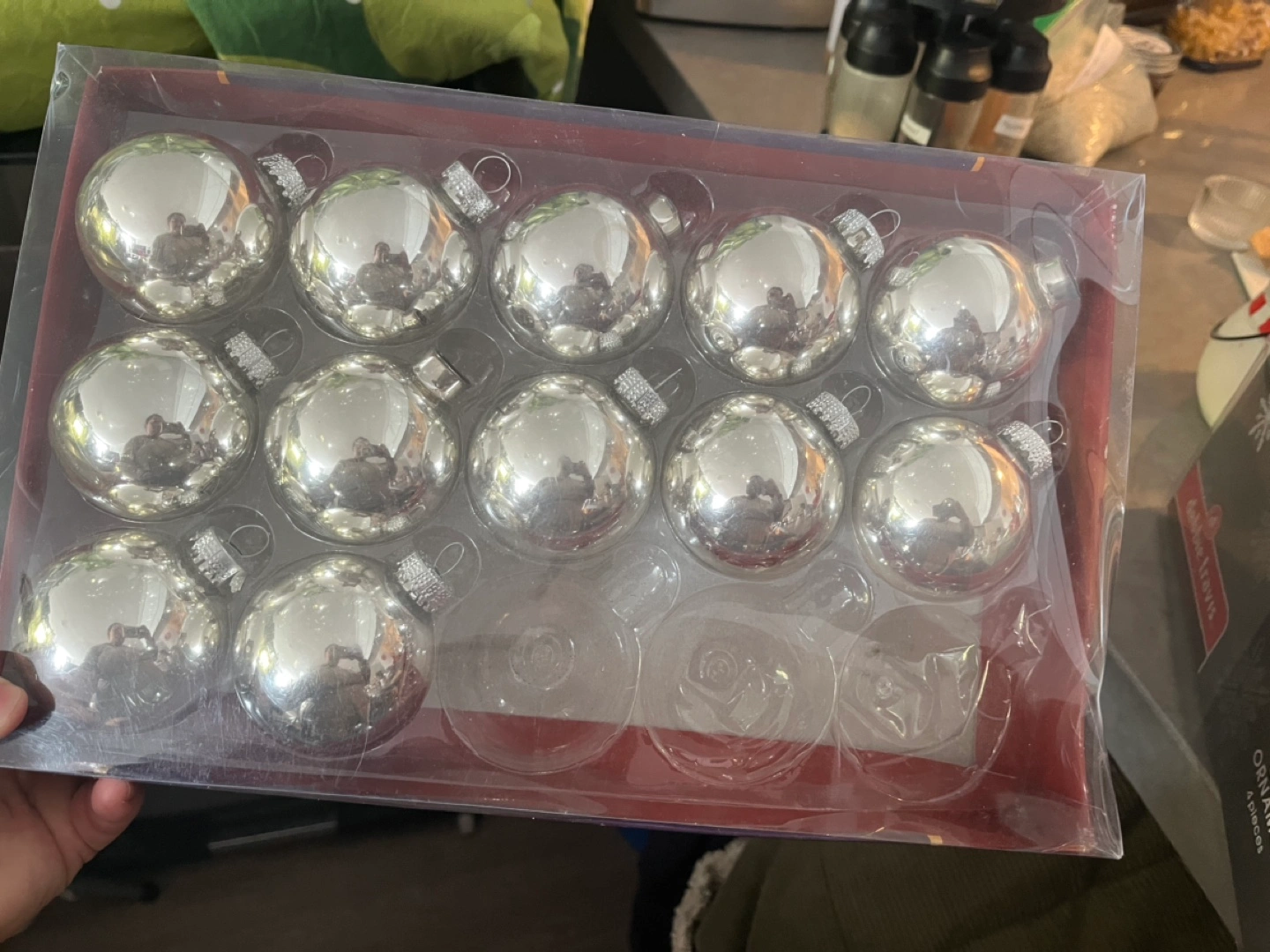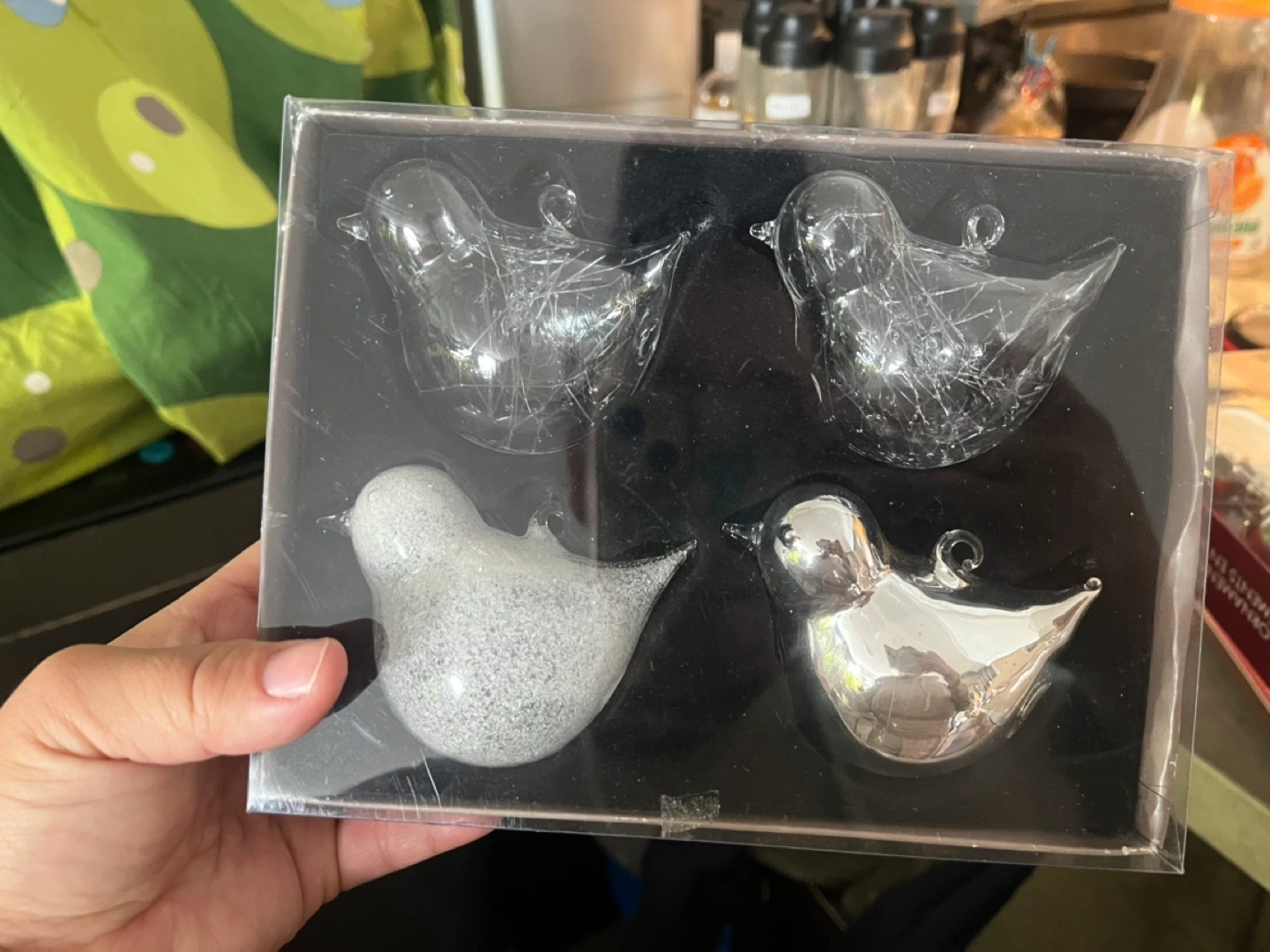 Silver Christmas ornaments in a box. There are some bird ornaments as well as outdoor Christmas lights. They are new. Please send me an offer
