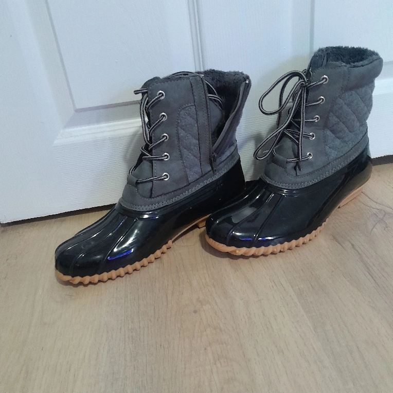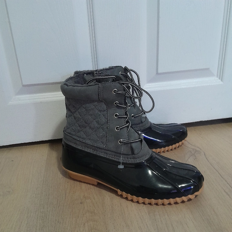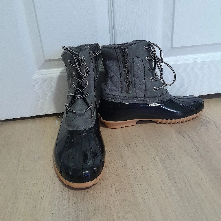 Brand new Grey duck boots with black rubber bottoms. Lace-up closure and side zipper. Warm, comfortable, and stylish.