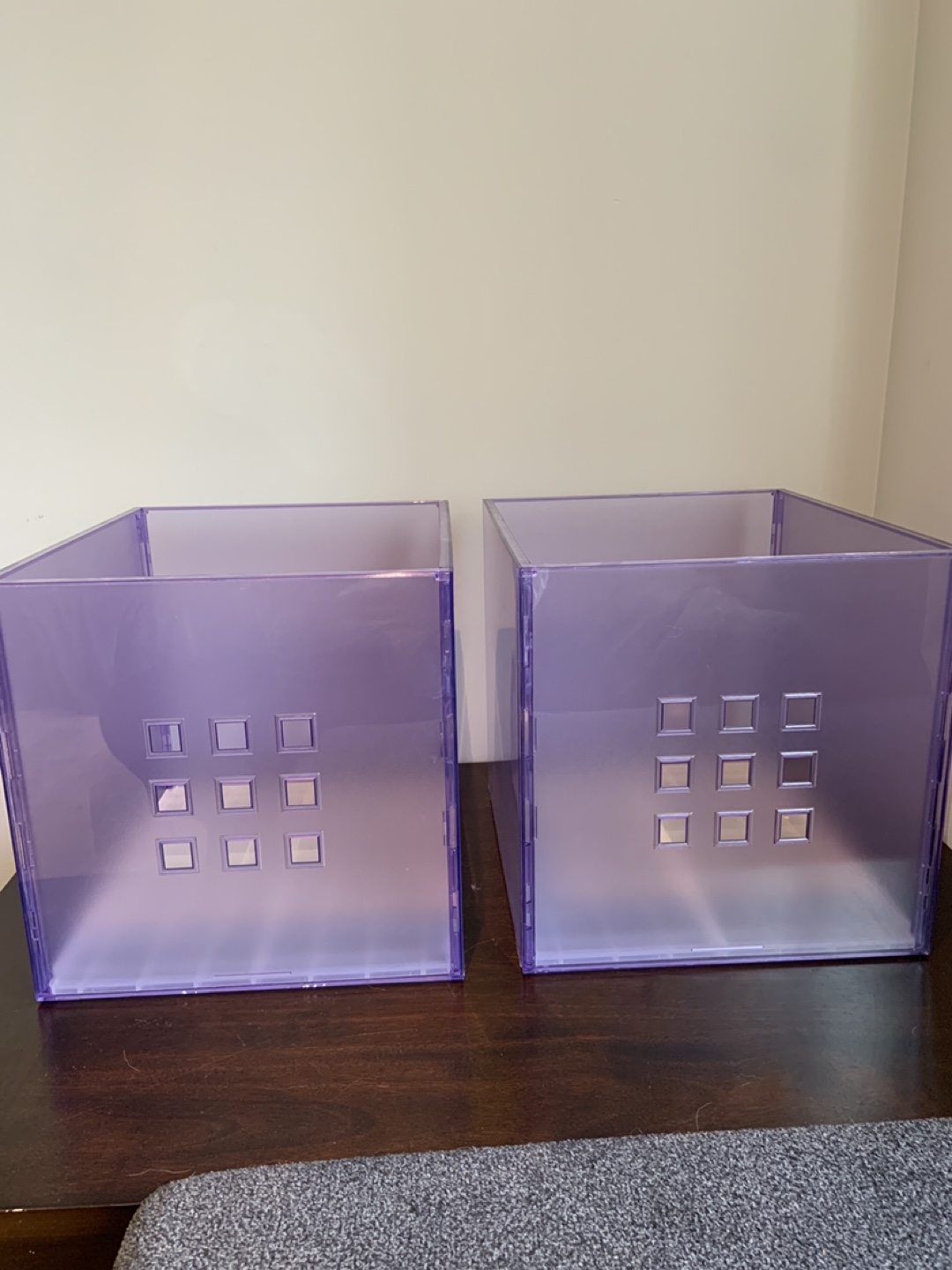 Two purple storage bins. Solid Plastic with cut-out design. Fits IKEA Kallax units W13” H 13” D 14.5 “